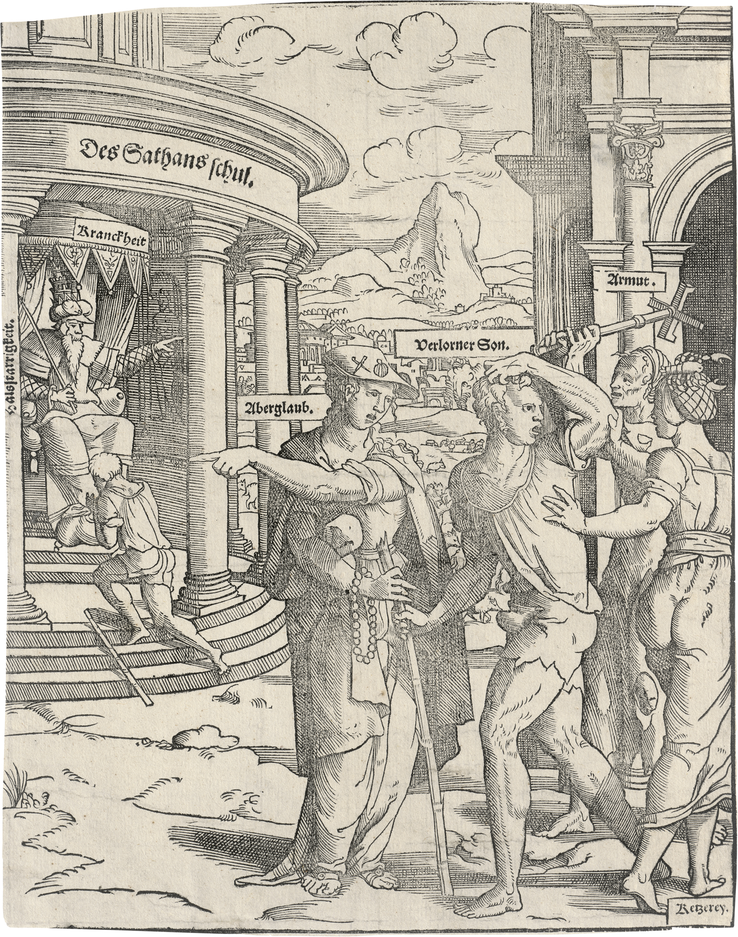 Der verlorene Sohn wird zum Tempel Satans geführt. Holzschnitt. 26,6 x 21,4 cm. Um 1545. Nicht in Meyer's Künstlerlexikon, Nijhoff 189, Hollstein (Teunissen) 7. Wz. Hohe Krone.