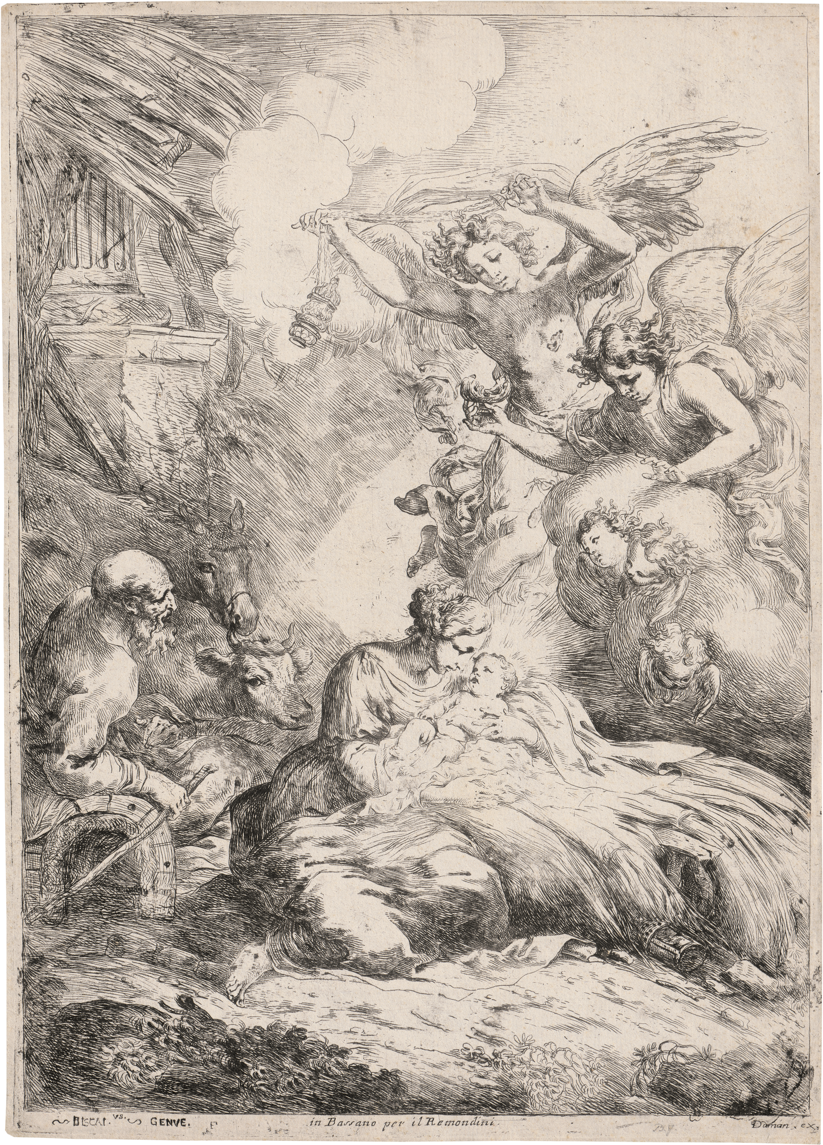 Die Geburt mit Engeln. Radierung. 39,3 x 28 cm. B. 7, TIB 47, Part 1 (Commentary) 7 VI (von VIII).