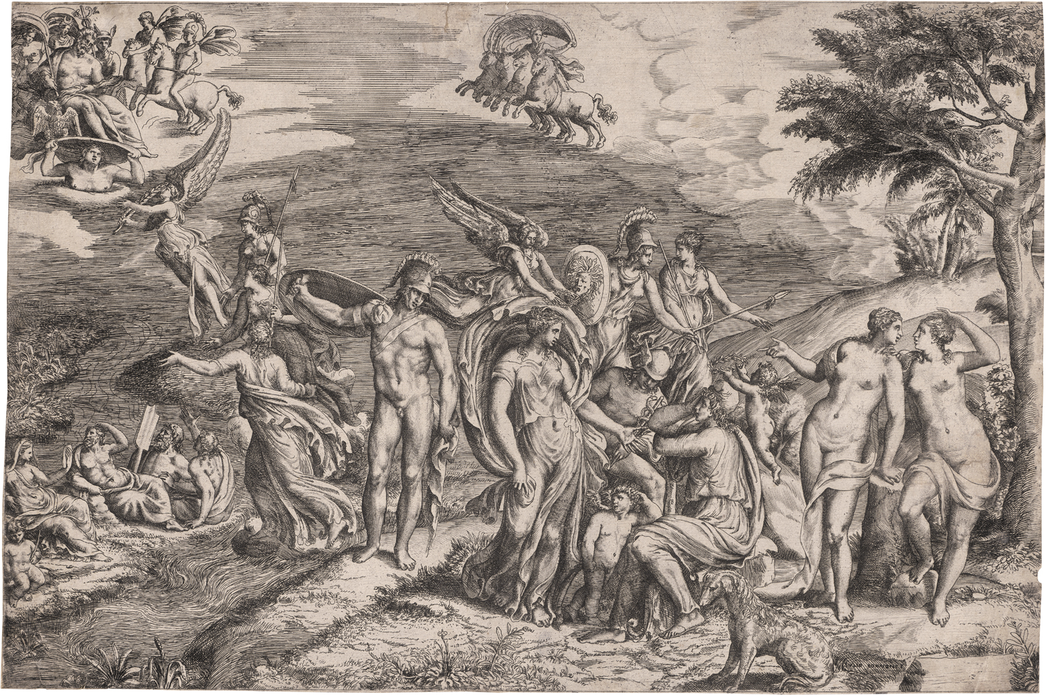 Das Parisurteil. Radierung und Grabstichel. 29,9 x 45,4 cm. B. 112, Passavant V, S. 103, Massari 216 II. Wz. Kompass im Kreis.