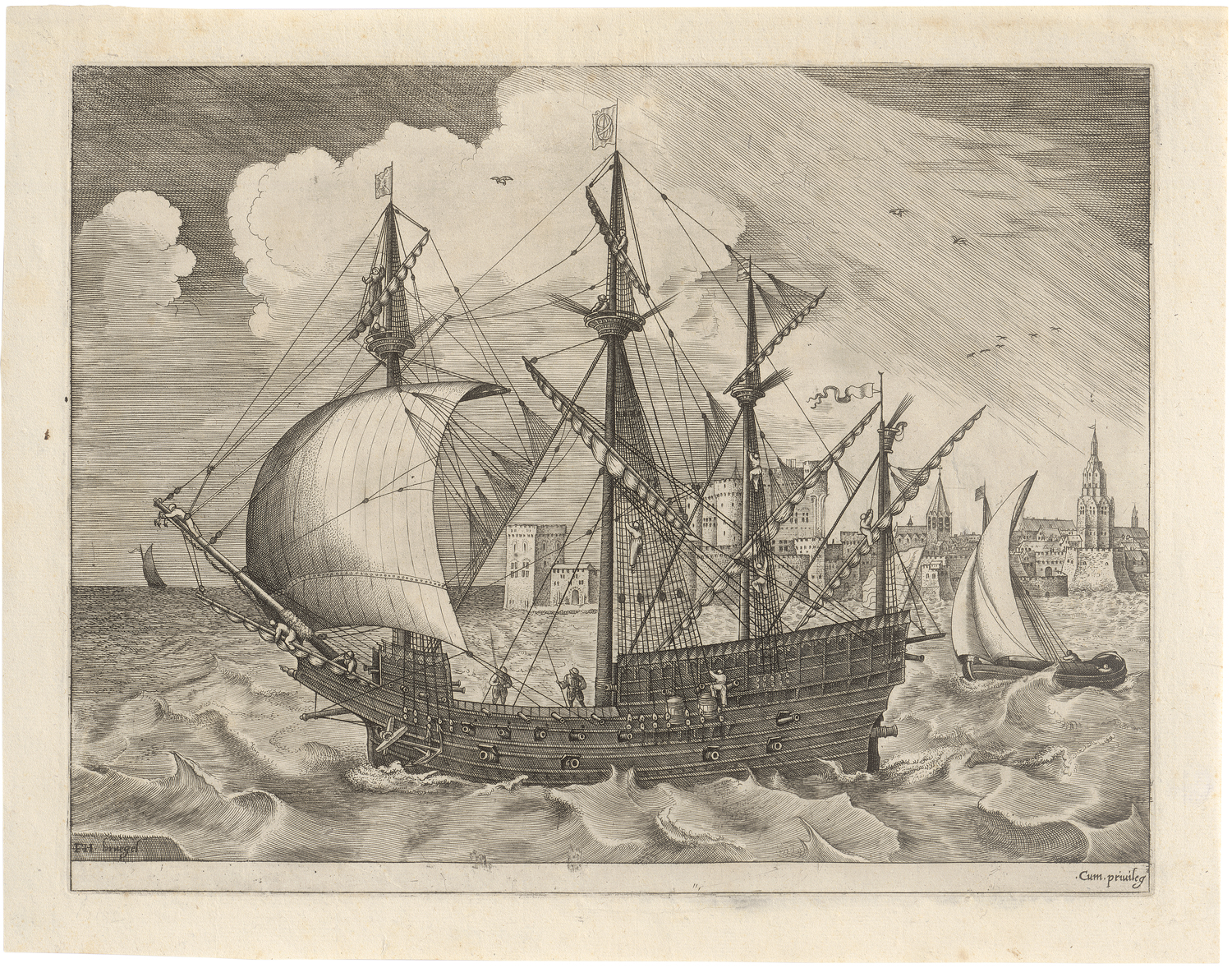 Vorliegendes Schiff ist Teil einer insgesamt zehn Blatt umfassenden, nach weitestgehend verlorenen Vorlagen Pieter Bruegels, die eine Reihe von Segelschiffen zeigt und unter anderem die Lust nach Reisen in die Ferne bediente. - Noch mit dem Privilieg und vor der Nummer. Ganz ausgezeichneter, klarer und prägnanter Druck mit schmalem Rand. Nur minimal fleckig, leichte Handhabungs- und Knickspuren verso, kleines Löchlein in der Stadtsilhouette rechts, links winziges Rostfleckchen im weißen Rand, sonst schön und original erhalten.