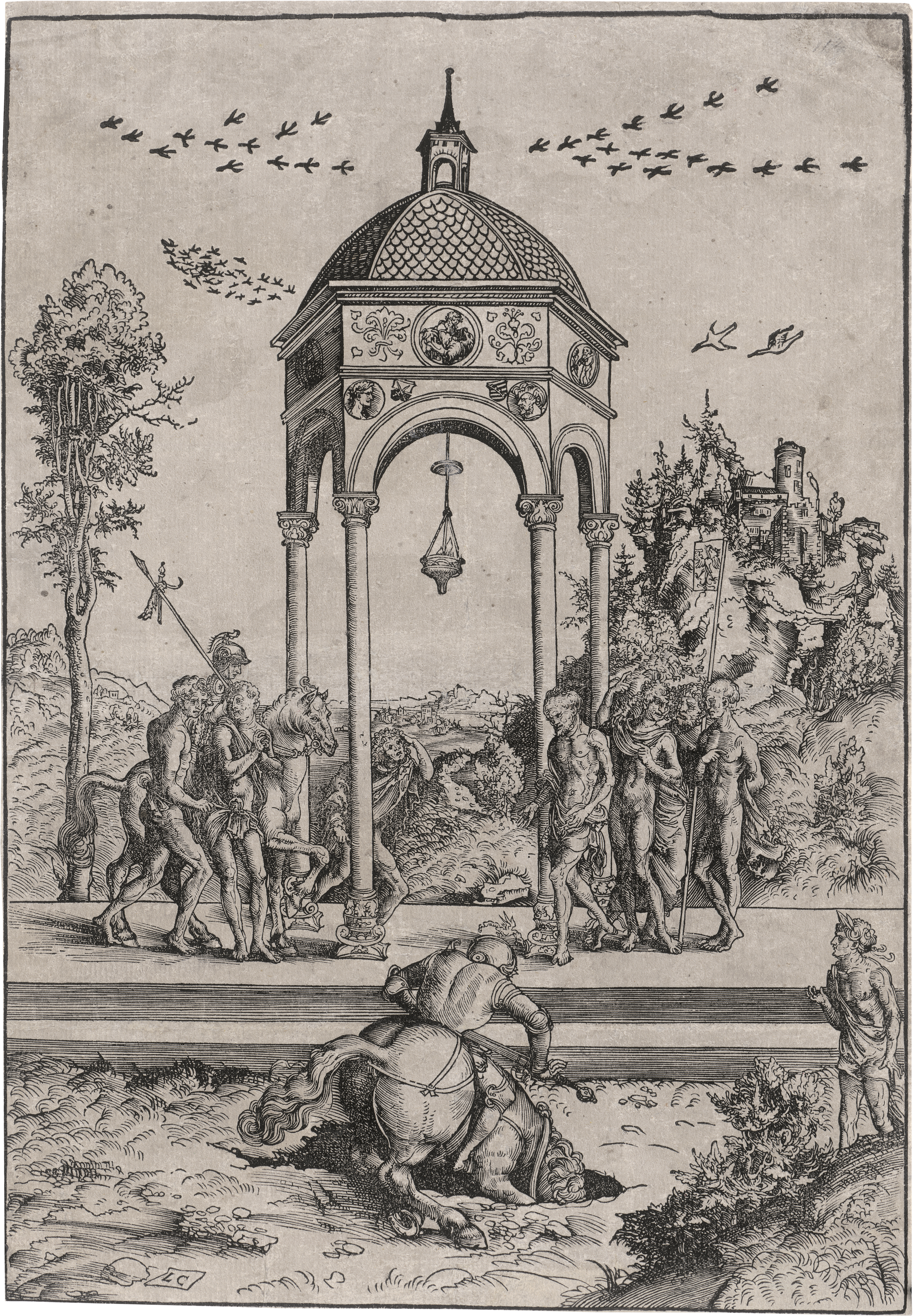 Der Opfertod des Marcus Curtius. Holzschnitt. 34 x 22,6 cm. B. 112, Hollstein 106. Wz. Hohe Krone.