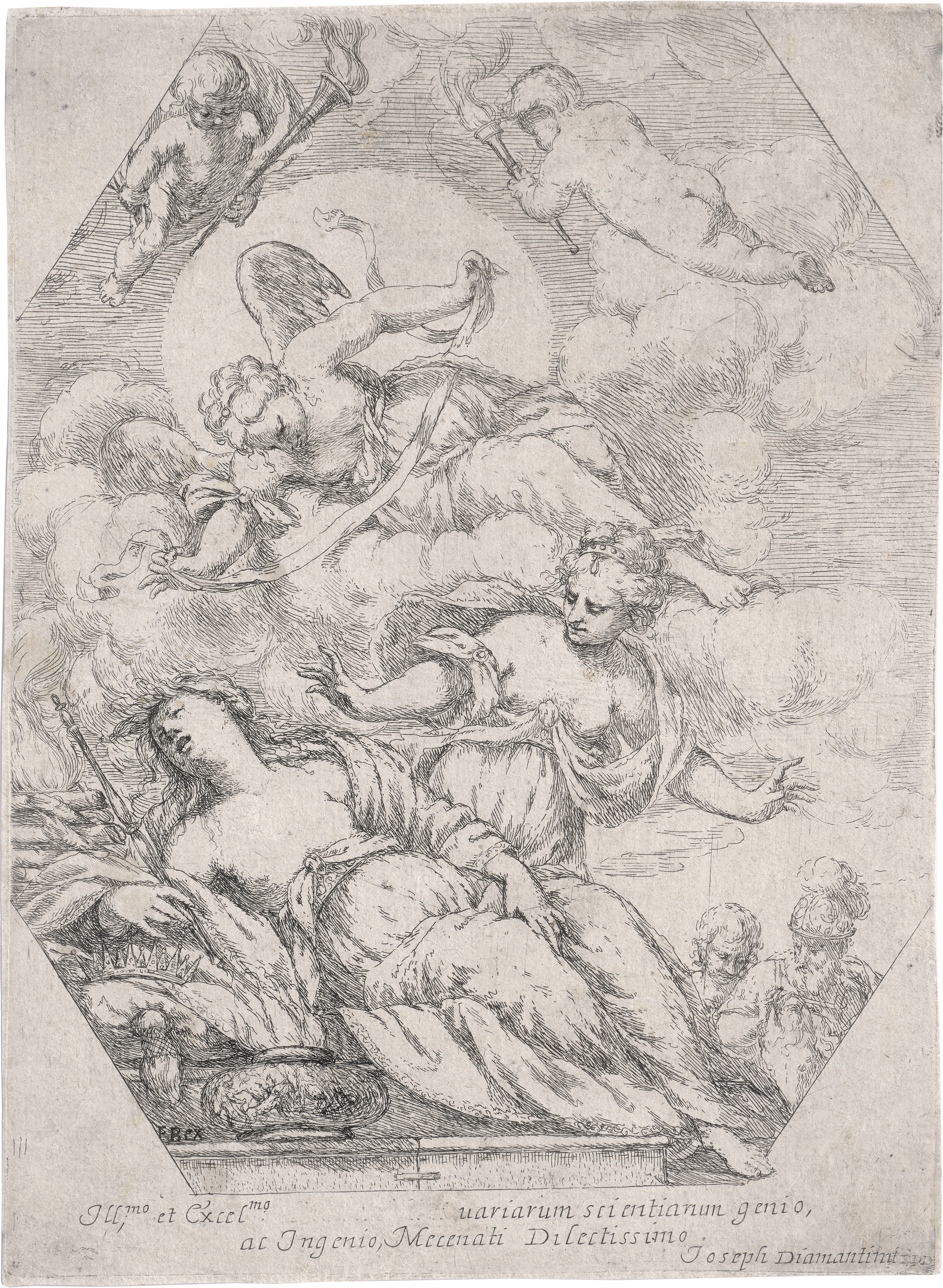 Giuseppe Diamantini zählt zu den führenden venezianischen Radierern der zweiten Hälfte des Seicento, obwohl er aus Fossombrone in den Marken stammte. Ausgebildet in Bologna, wo er bei Giovanni Andrea Sirani in die Lehre ging und vom Vorbild Simone Cantarinis wesentlich geprägt wurde, ließ sich Diamantini um 1662 in Venedig nieder, wo er fast sein ganzes Leben als Maler und Radierer tätig sein sollte. Viele seiner Blätter erschienen in sehr kleinen Auflagen, was auch die Seltenheit der vorliegenden Radierung erklärt. Ausgezeichneter Druck mit feinem Rändchen um die Plattenkante, rechts bis auf diese beschnitten. Geringfügige Erhaltungsmängel, kleine Ausbesserung in der rechten oberen Ecke, verso etwas angestaubt, sonst sehr gutes Exemplar.