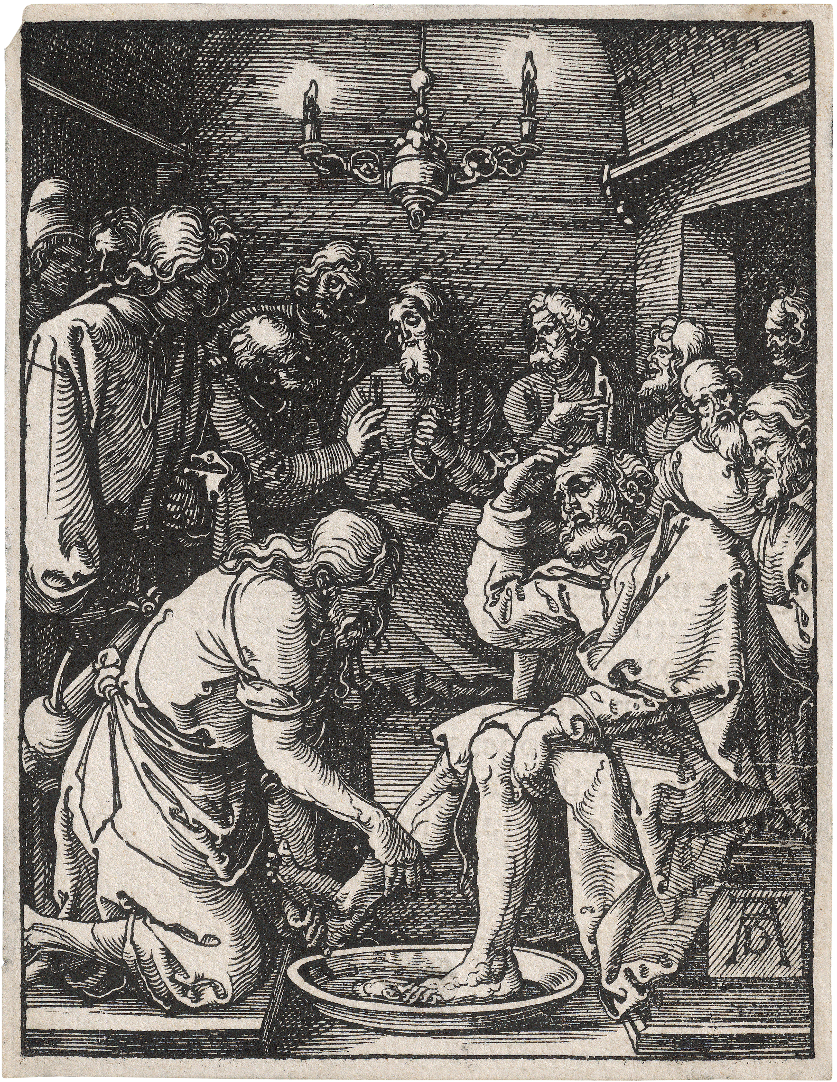 Die Fußwaschung. Holzschnitt. 12,7 x 9,8 cm. Um 1509-1511. B. 25, Meder 134 lateinische Textausgabe von 1511.