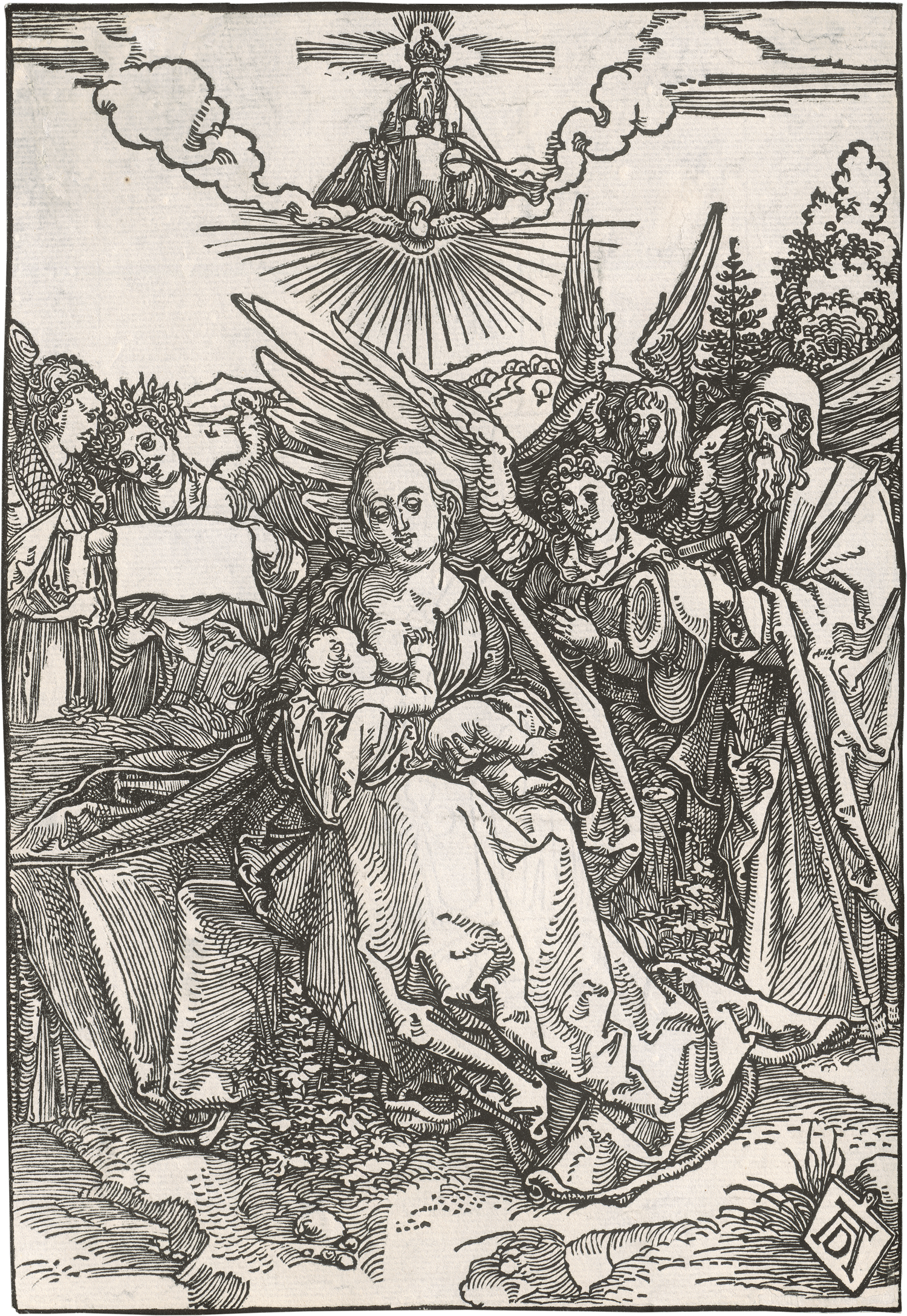 Die Heilige Familie mit fünf Engeln. Holzschnitt. 21,7 x 14,7 cm. B. 99, Meder 214 a (von g). Wz. Hohe Krone (Meder 20).