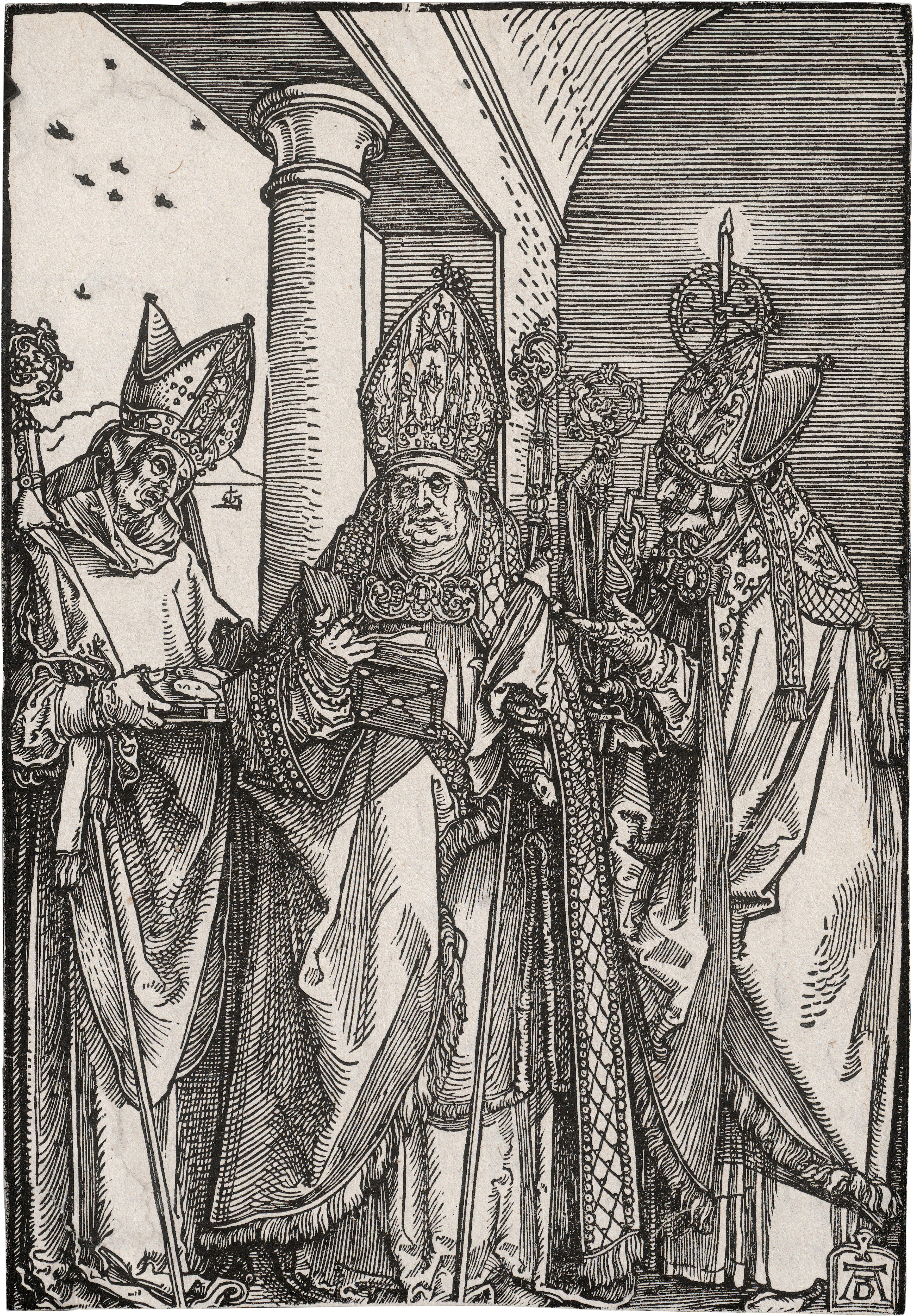 Die heiligen Bischöfe Nikolaus, Ulrich und Erasmus. Holzschnitt. 21,3 x 14,6 cm. Um 1508. B. 118, Meder 233 c-e (von e). Wz. Kleines Stadttor (Meder 273).