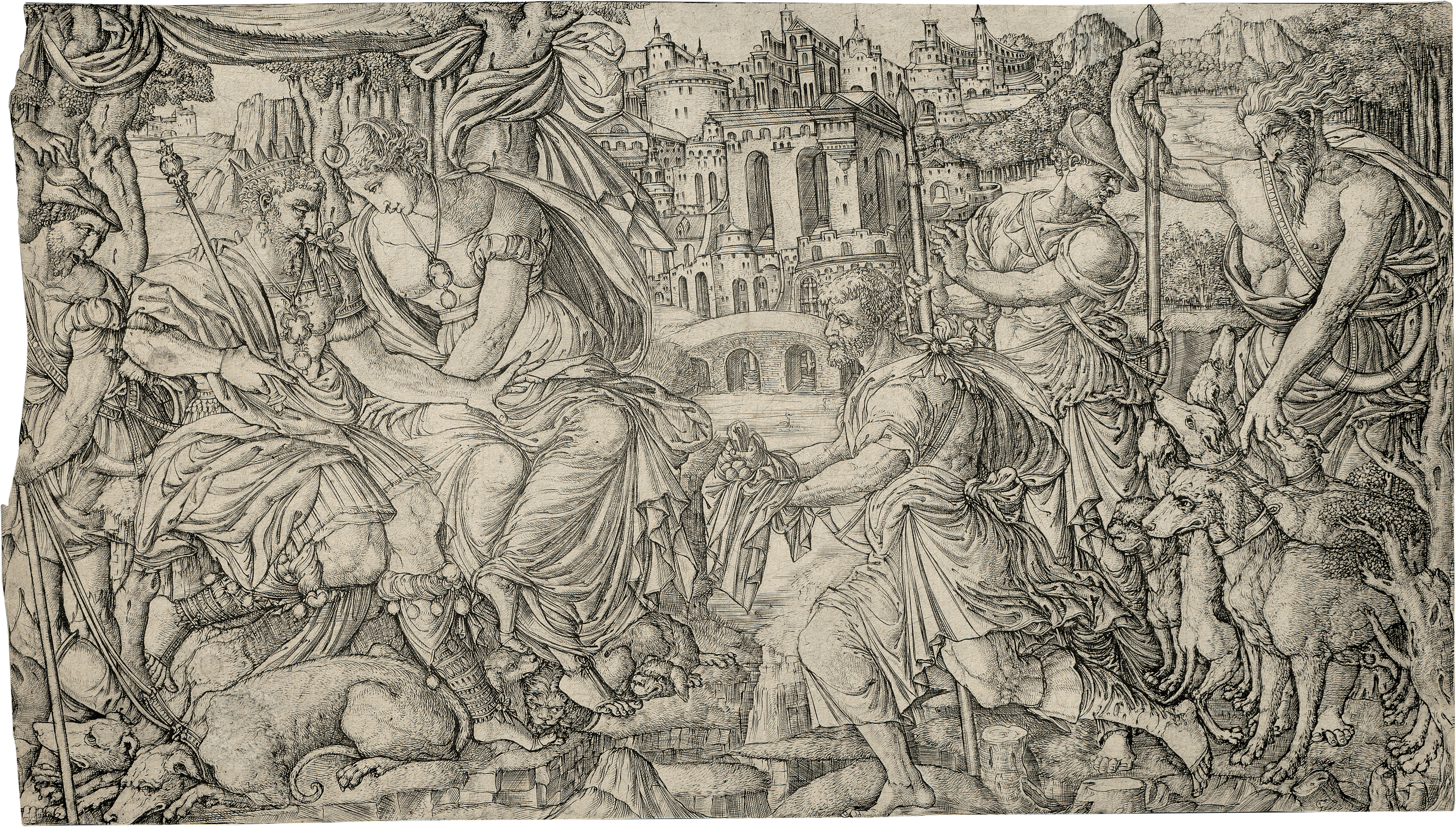 Ein König und Diana empfangen Jäger (Un chasseur apportant un présent à un roi). Kupferstich. 22,1 x 38,8 cm. B. 39, Robert-Dumesnil 54, Bersier 67, Eisler 32, Zerner (in: The French Renaissance in Prints, Ausst. Kat. Los Angeles 1994) Nr. 19. Wz. Traube.
