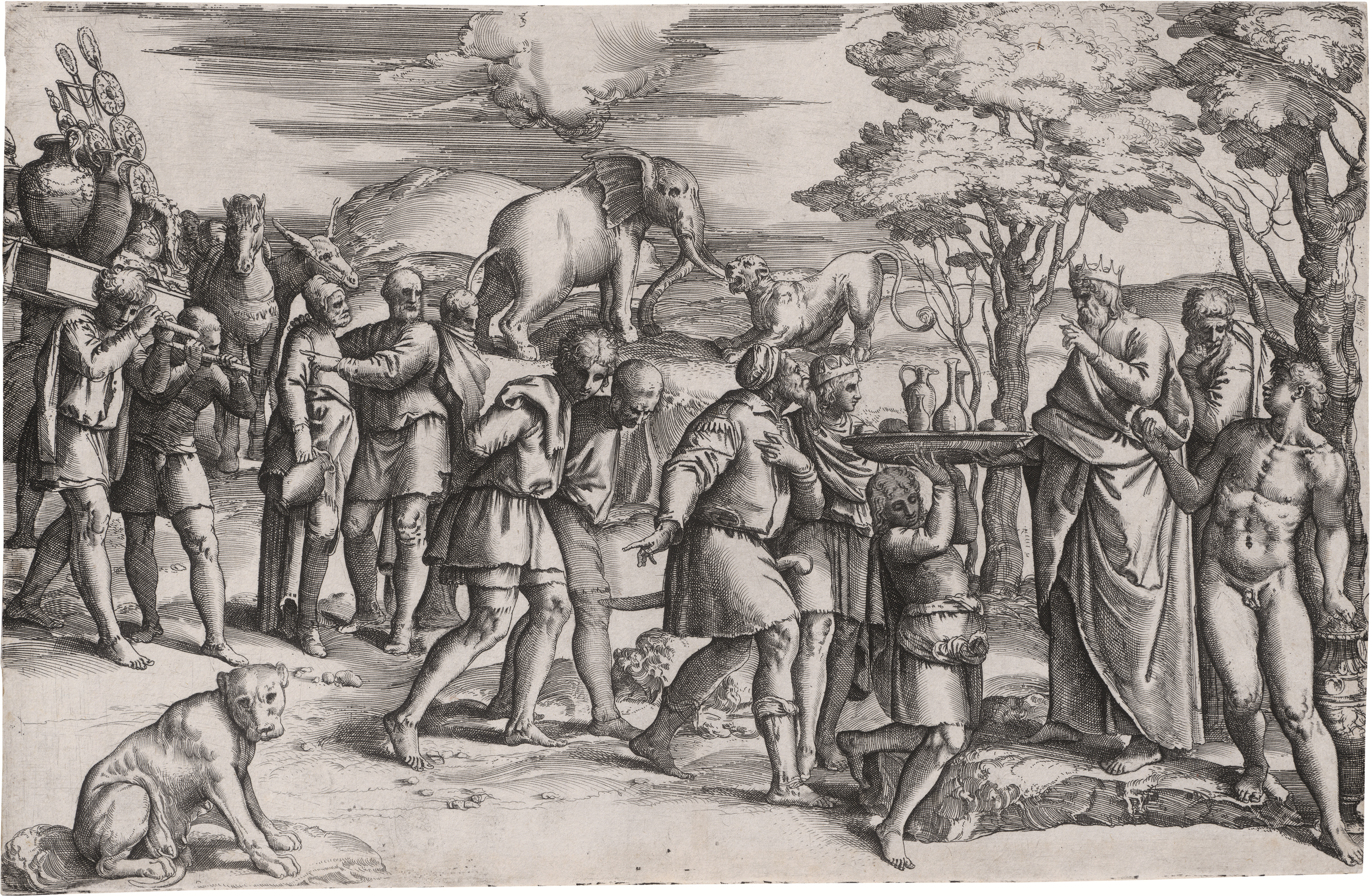 Melchisedek bietet Abraham Brot und Wein an. Radierung und Grabstichel. 27 x 42 cm. B. XVI, S. 120, 5 I (von II). Wz. Leiter (?) im Kreis mit sechszackigem Stern.