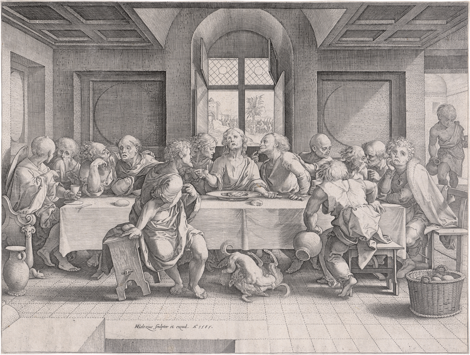 Das letzte Abendmahl. Kupferstich nach Pieter Coecke van Aelst. 27,9 x 36,8 cm. 1585. B. 39, Hollstein 33 I (von II), Leesberg (New Hollstein) 324 II (von III). Wz. Gekröntes Wappen von Burgund und Österreich (vgl. New Hollstein, Muller Dynasty, Bd. II, S. 293, Nr. 1 a-b; Briquet 2293: 1587).