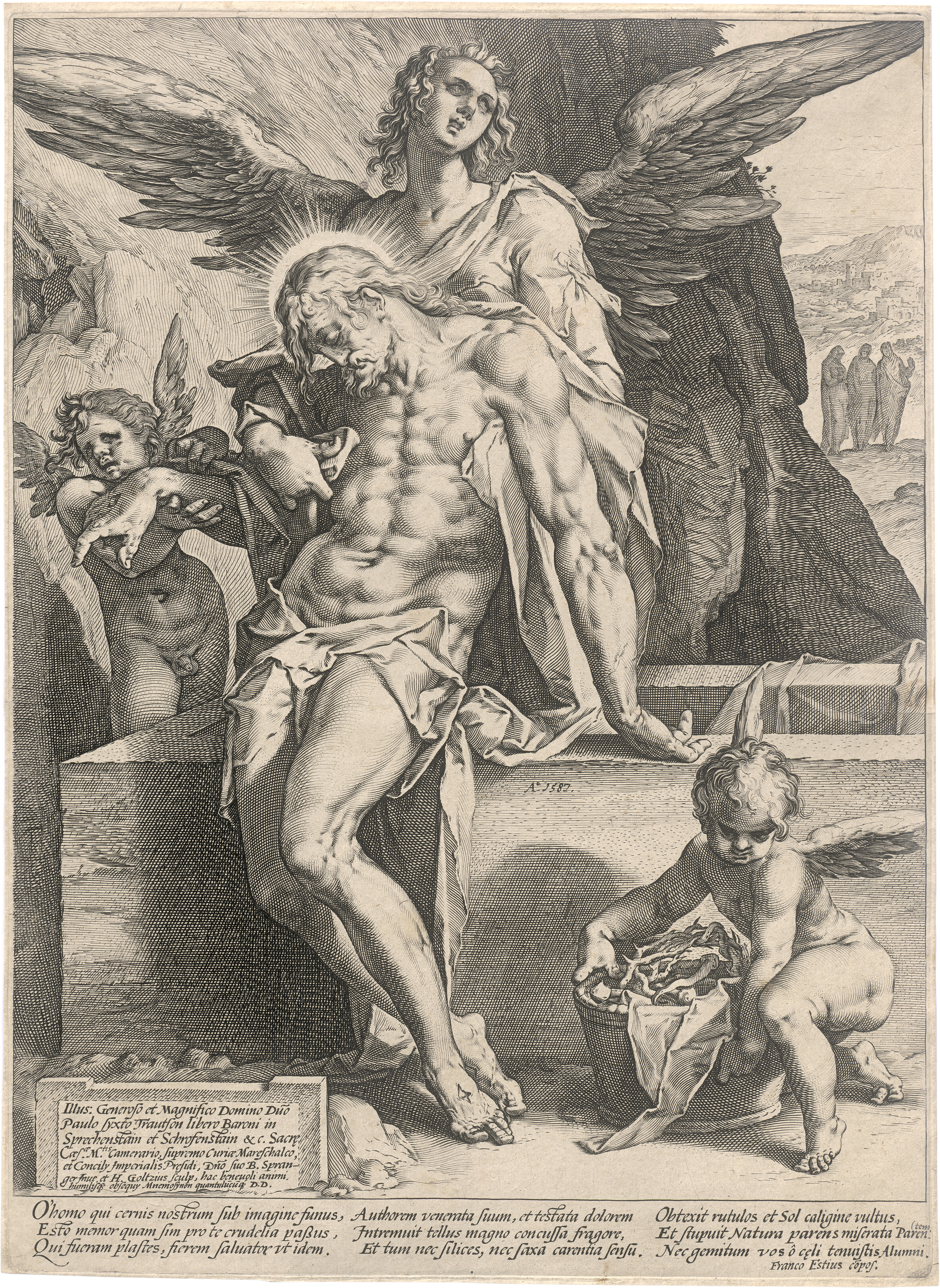 Der Körper des toten Christus, von einem Engel getragen. Kupferstich nach Bartholomäus Spranger. 34,5 x 25,3 cm. 1587. B. 273, Hollstein 320, Leesberg (New Hollstein) 339. Wz. Einfaches Straßburger Lilienwappen mit angehängten Buchstaben WR und Nummer 4 (vgl. New Hollstein, Muller Dynasty, Bd. II, S. 316, Nr. 8a, Amsterdam, um 1588).