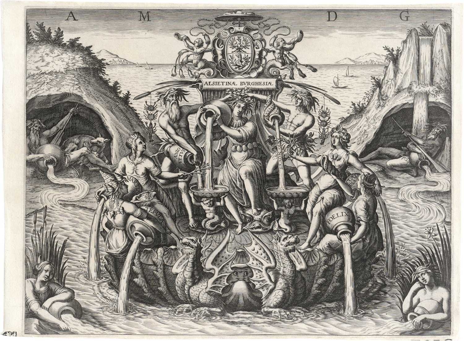 Allegorie auf den Borghesebrunnen in Rom. Kupferstich, 27 x 35,2 cm. Nicht bei Diefenbacher (New Hollstein).