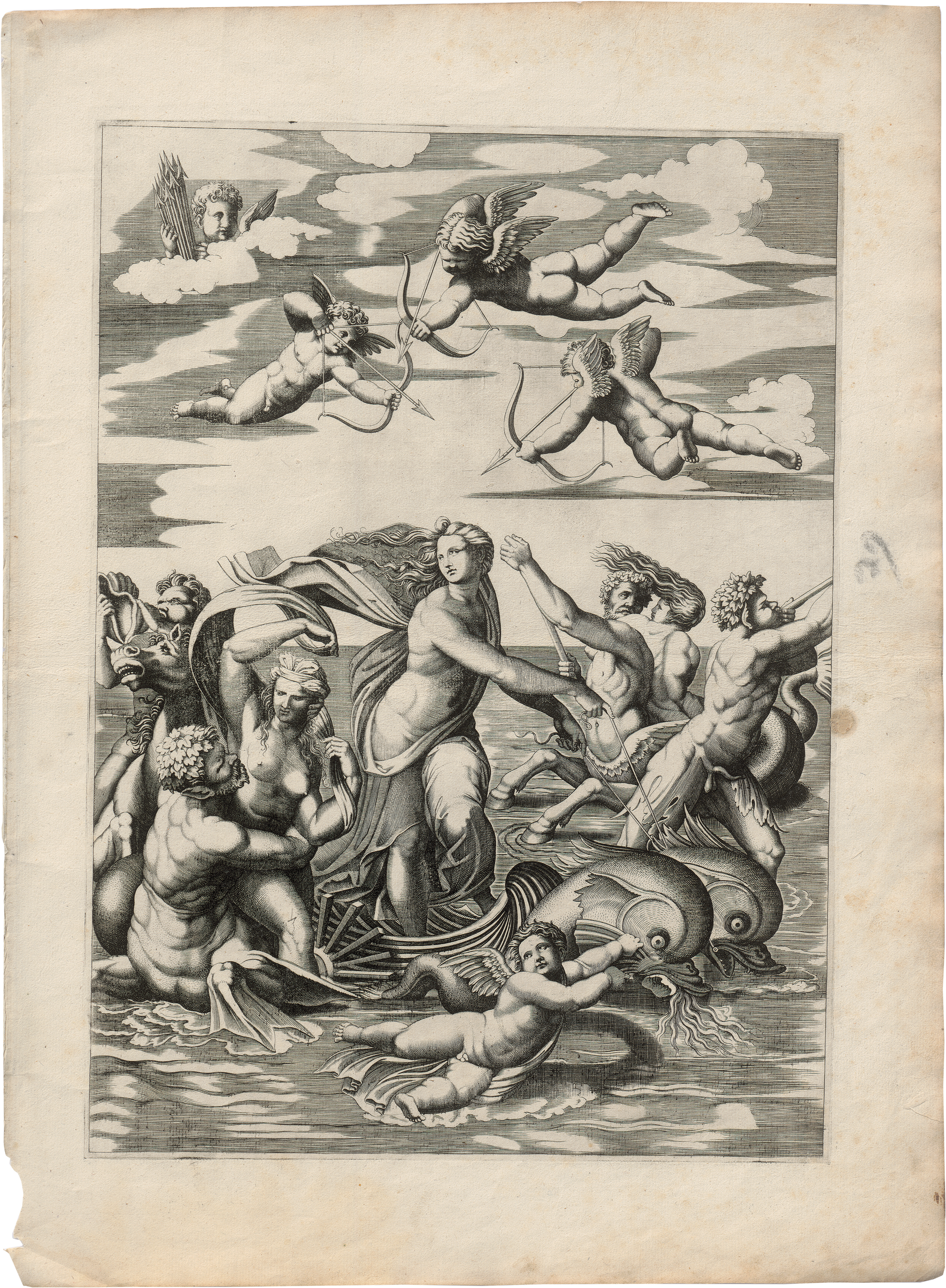 Bei der großformatigen Darstellung der Galathea handelt es sich um eine der zwei bei Bartsch beschriebenen Kopien nach dem Kupferstich Raimondis. Der technisch hochentwickelte Kupferstich stammt von der Hand eines anonymen italienischern Graveurs, der für den römischen Verlag des Antonio Lafreri tätig gewesen ist. - Ganz ausgezeichneter, kontrastreicher Abzug mit feinem Plattenton, mit breitem Rand um die deutlich zeichnende Plattenkante. Leichte Altersspuren und Erhaltungsmängel, am linken Rand Spuren alter Bindung, alte Kreideannotation im rechten Rand, sonst sehr gut erhalten.