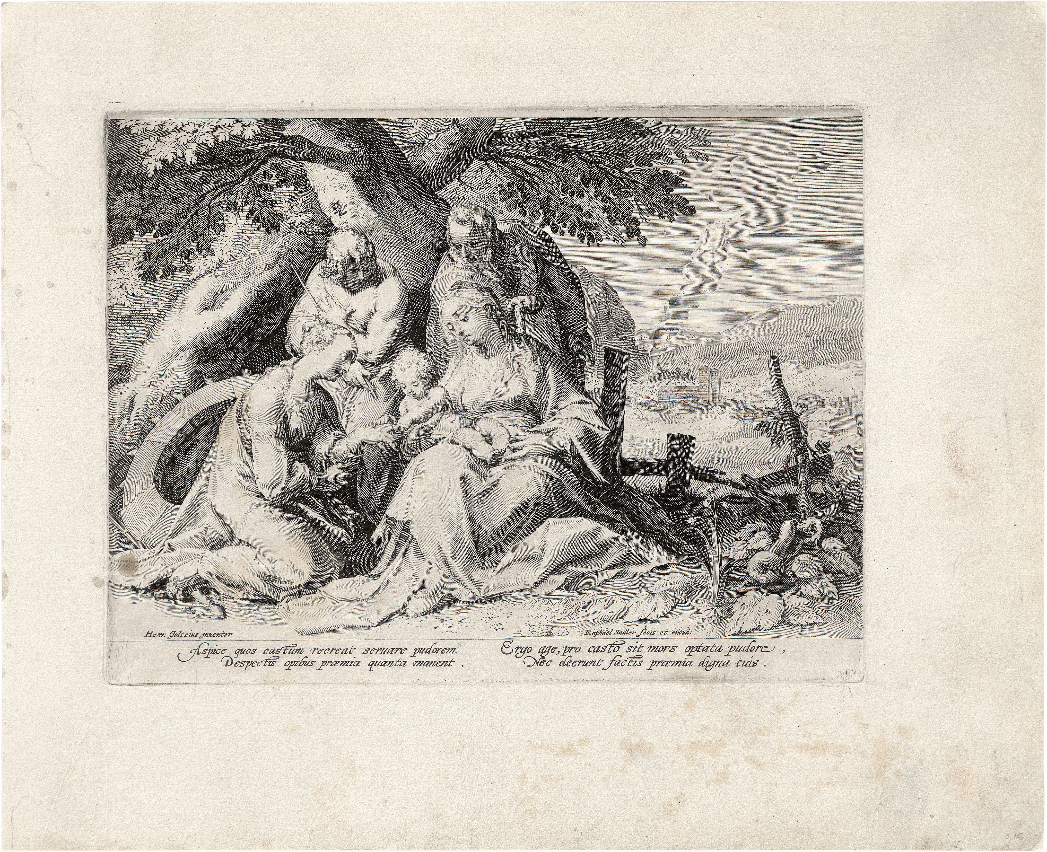 Die Heilige Familie mit den hll. Katharina und Sebastian (Die mystische Vermählung der hl. Katharina). Kupferstich nach Hendrick Goltzius. 18,3 x 24,3 cm. Hollstein 78, Leesberg (New Hollstein, Goltzius) 463.