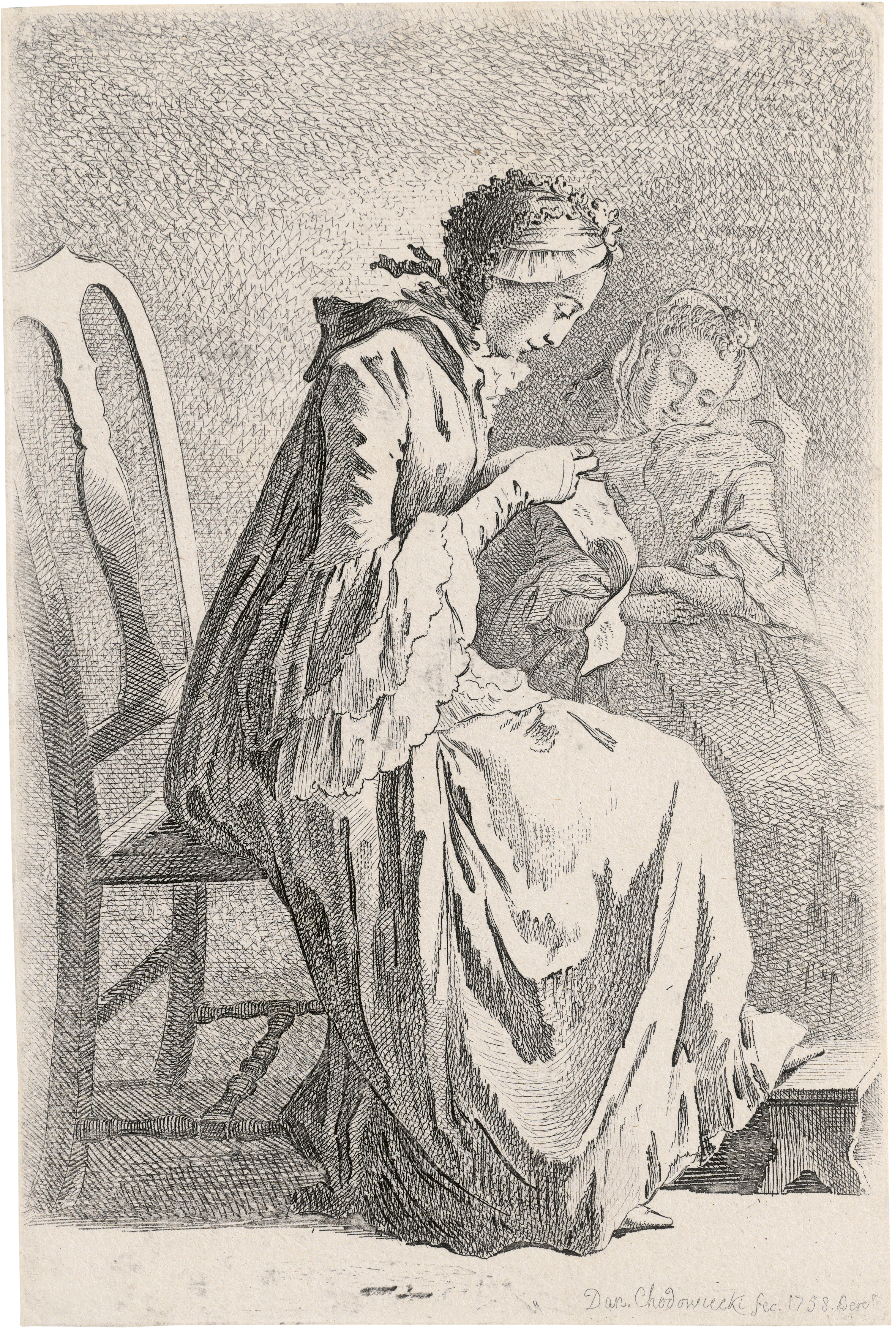 Die beiden sitzenden Damen (Demoiselle Quantin und die Gattin des Künstlers). Radierung. 14,1 x 9,3 cm. 1758. Engelmann 11 II.