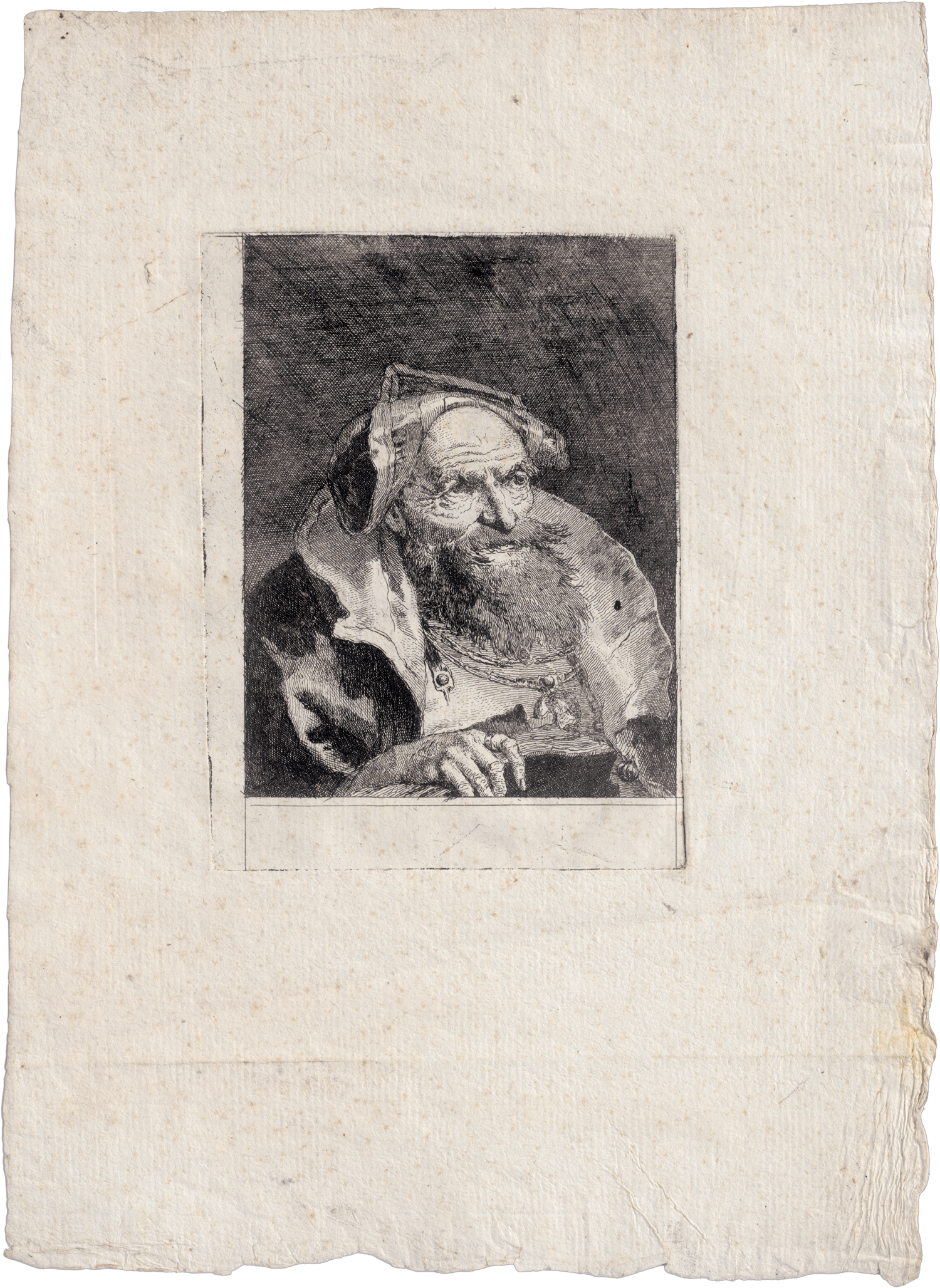Alter Mann mit Buch (Vecchio con libro). Radierung. 15,6 x 11,6 cm. De Vesme 143, Rizzi (1970) 183 I (von II), Rizzi (1971) 187 I (von II), Succi 122 I (von III). Wz. Nebenmarke FL.