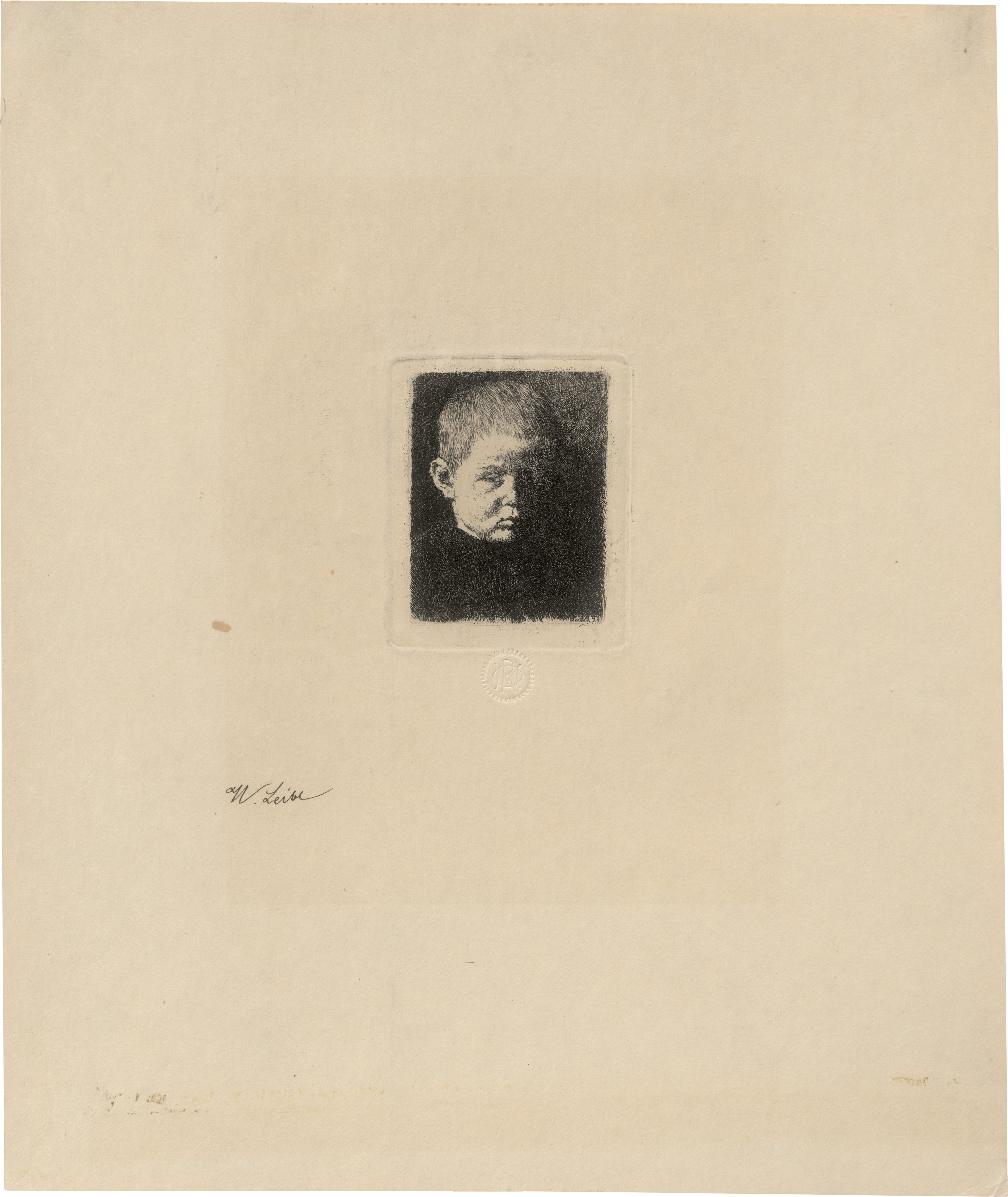 Das reizende Knabenbildnis stellt die kleinste Platte im druckgraphischen Schaffen Leibls dar. Mit der römischen Zahl oben rechts und vor dem Namen von Heinrich Wetteroth in der Druckplatte. Ganz ausgezeichneter, toniger und kräftiger Druck mit breitem Rand. Minimal angestaubt und vereinzelt minimal fleckig, vereinzelt leicht gegilbt, sonst in sehr schöner Erhaltung. Unterhalb der Darstellung mit dem Trockenstempel des Vereins für Original-Radierung, München (nicht bei Lugt).