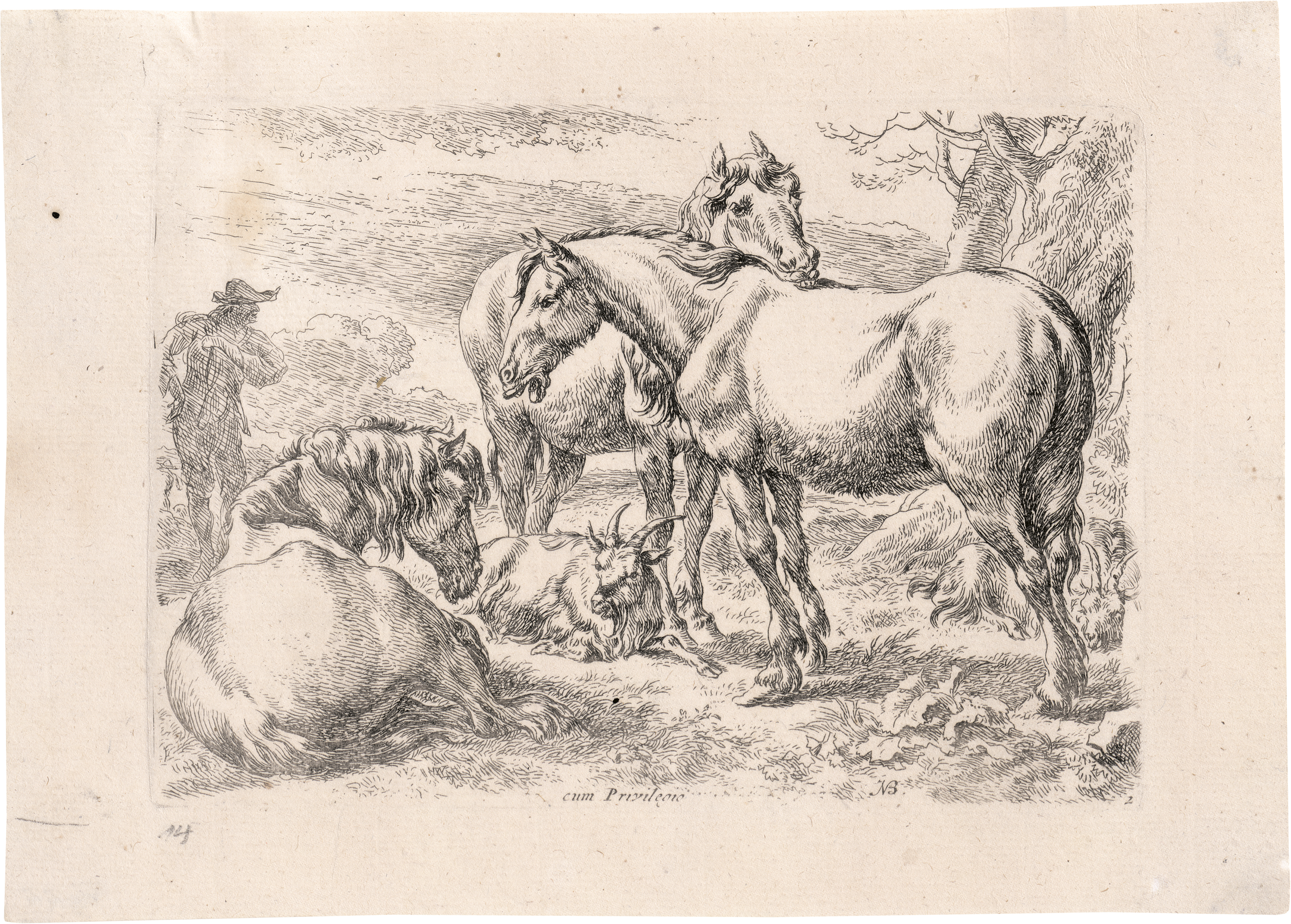 Aus der Folge "Animalia", vollständig vorhanden sind "Die Folge mit den querformatigen Tieren und den beiden Ziegenköpfen", "Die Folge mit den Schafen und der singenden Hirtin", vor Löschung des Buchstaben "c", "Die Folge mit den Schafen (sog. Frauen-Buch)" und "Die Folge mit den Ziegen" ohne das Titelblatt. Sämtlich ausgezeichnete Drucke mit feinem bzw. teils mit schmalem Rand, auch auf die Darstellung geschnitten. Leicht angestaubt und vereinzelt fleckig, nur teilweise gebräunt, einzelnen Gebrauchs- und Handhabungsspuren, sonst insgesamt gut. Beigegeben ein Contre-Épreuve von der Radierung "Liegendes Mutterschaf mit zwei Lämmern" (vgl. Hollstein 42).