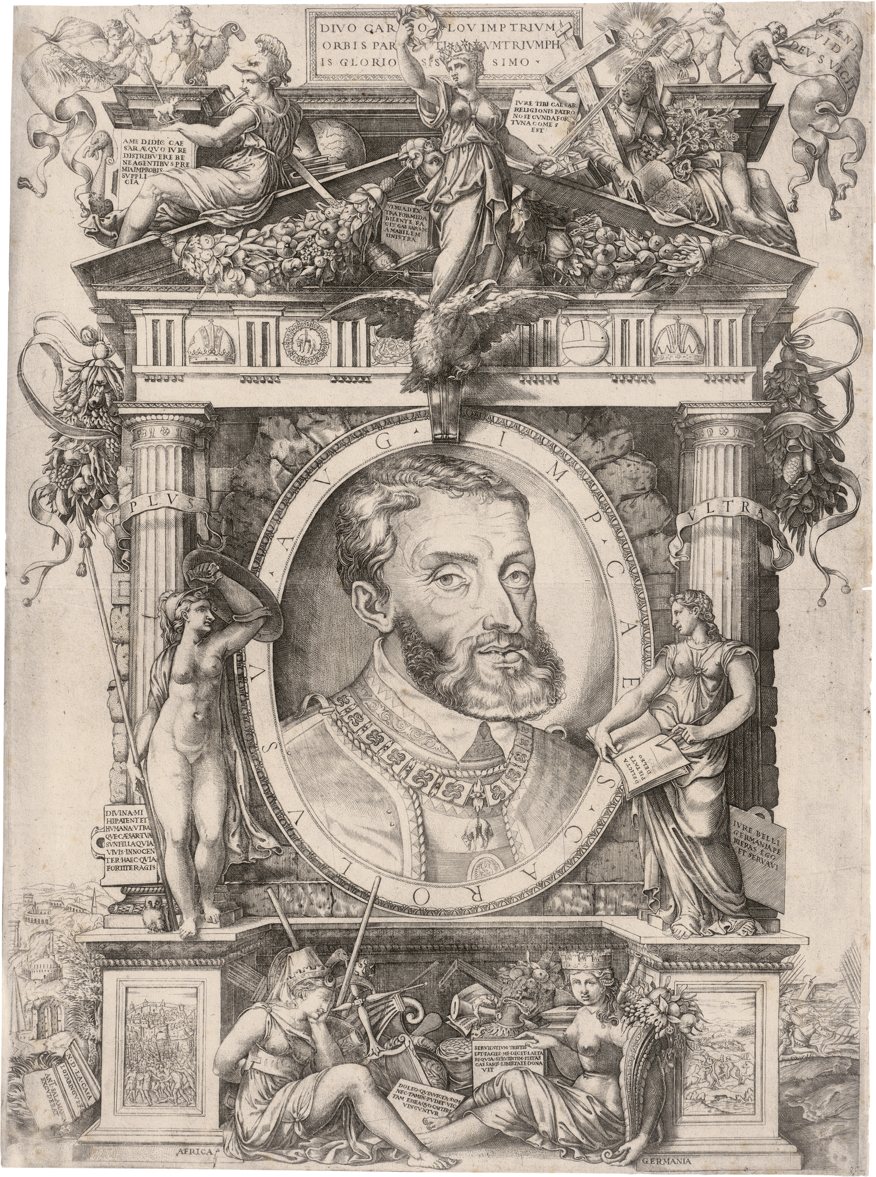 Bildnis des Kaisers Karl V. Kupferstich nach Enea Vico. 19,5 x 36,7 cm. Robert-Dumesnil 3. Wappen mit Buchstabe M und Stern.