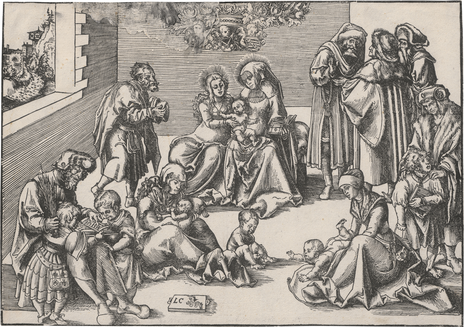 Die heilige Sippe. Holzschnitt. 22,8 x 32,7 cm. Um 1509/10. B. 5, Dodgson 79, Hollstein 71 II. Wz. Schreitender Löwe (?) mit Reichsapfel.