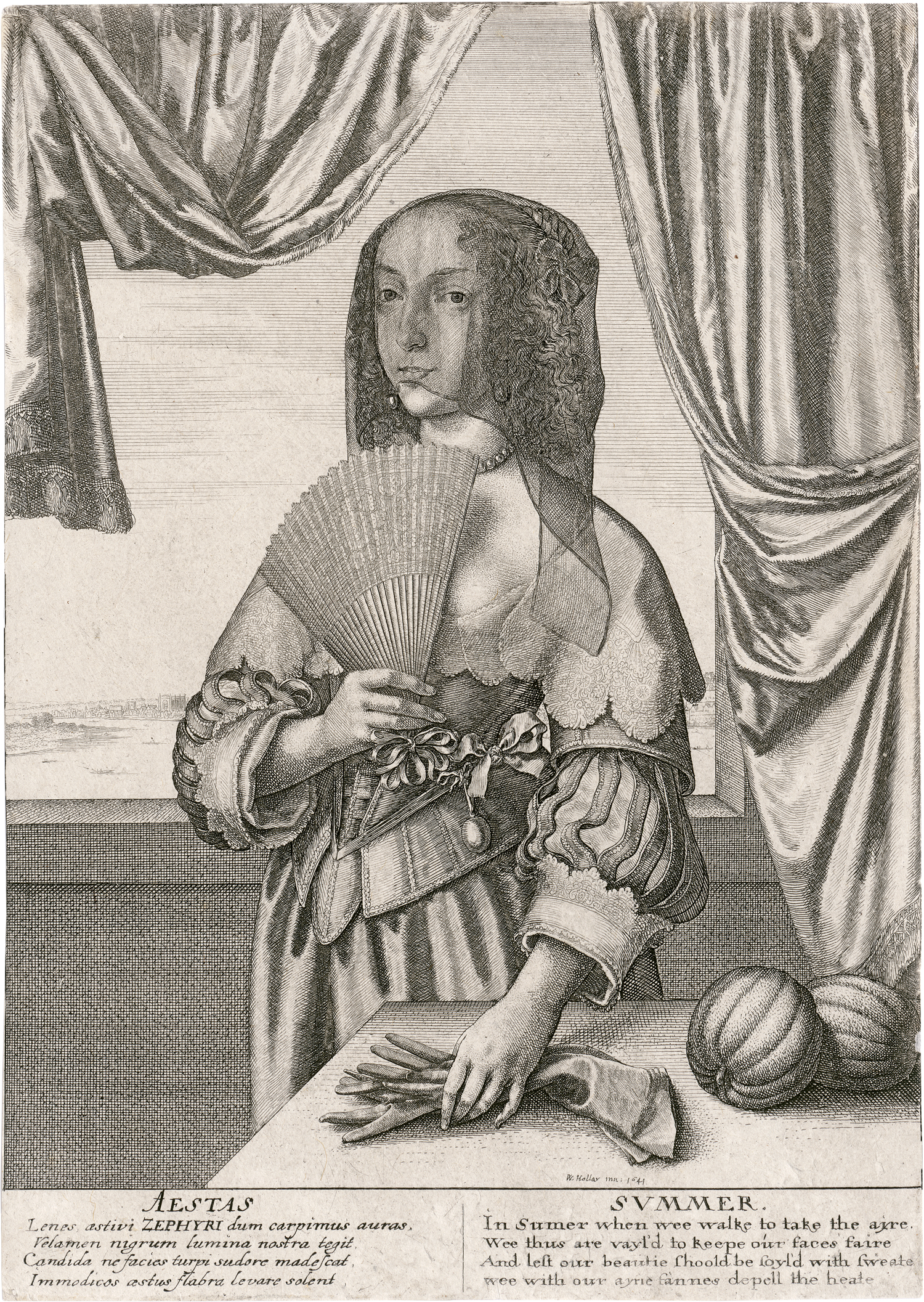 Allegorie des Sommers: Junge Frau mit Schleier, Fächer, Handschuhen und zwei Kürbissen. Kupferstich. 24,3 x 17,36 cm. 1641. Pennington 611, Turner (New Hollstein) 333 II.