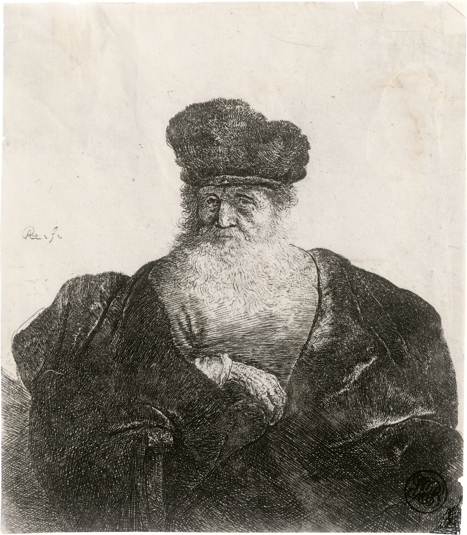 Greis im weiten Samtmantel. Radierung auf feinem Japan. 14,9 x 13 cm. Um 1631. B. 262, White/Boon (Hollstein) 262 II, Nowell-Usticke 262 III, Hinterding/Rutgers (New Hollstein) 92 III.