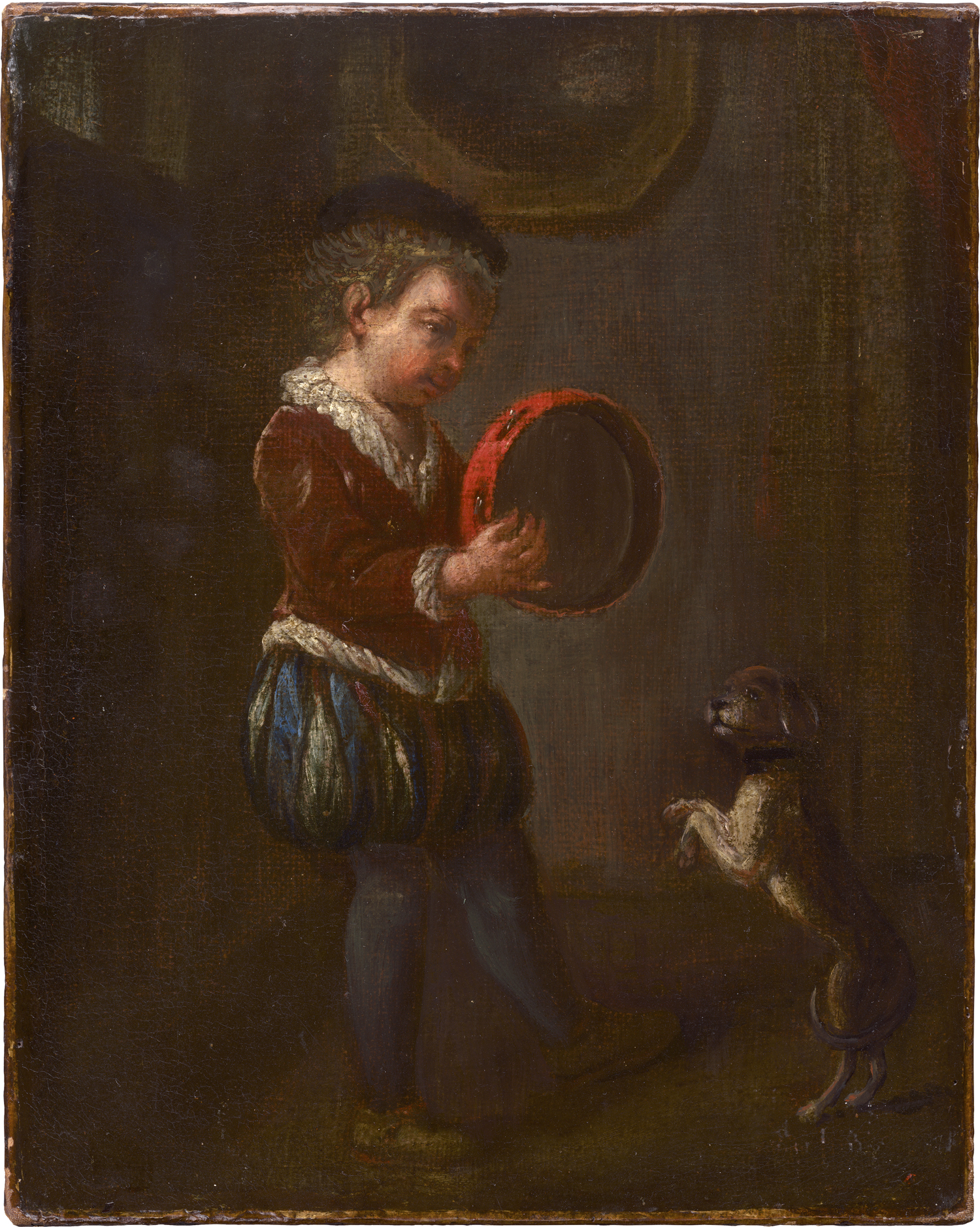 18. Jh. Kleiner Tamburinspieler mit tanzendem Hund