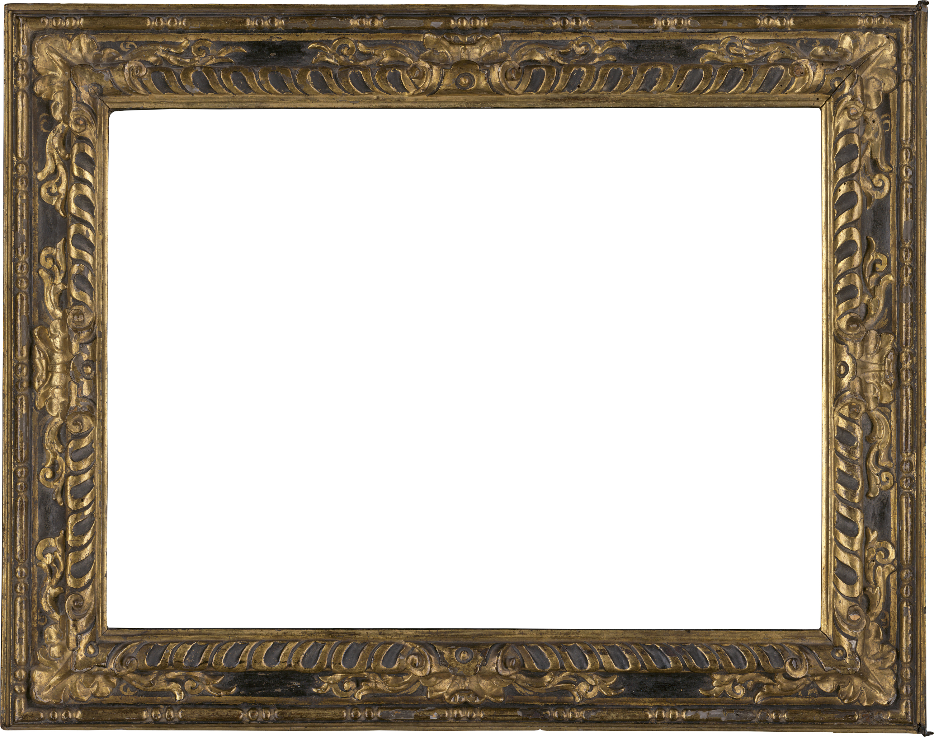 geschnitzt, ebonisiert und vergoldet, Sichtleiste glattes ansteigendes Profil, Wulstprofil mit Bandelementen und Blättern in den Ecken und Mitten, Astragal, abfallendes Profil als Abschluss. Mit Aufhänger.