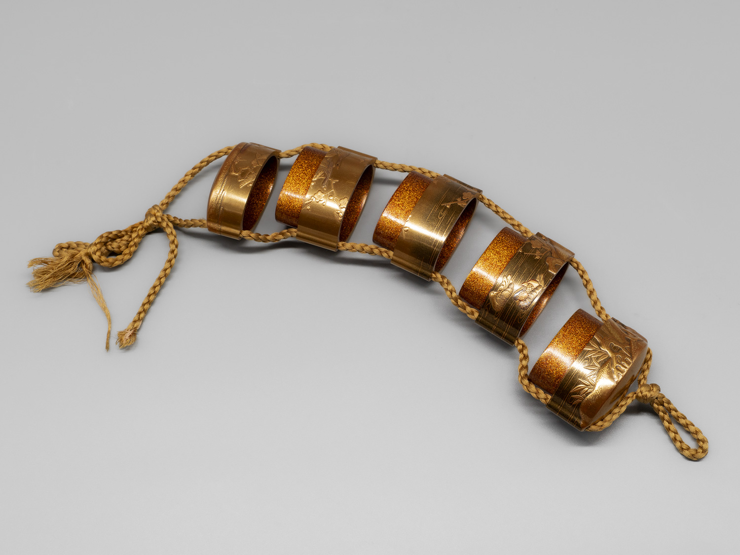 Inrô mit Enten-Golddekor. 5-teiliges Aufbewahrungs-Behältnis. Holzgefäß mit Kinji-Goldlackgrund über Entenmotiv in einer idealen Landschaft mit Pflaumenbäumen, innen Nashiji-Streulack in Kupfer. Mit sandfarbener Flechtkordel. 9,5 x 5 x 2,5 cm. Japan, Meiji-Zeit, spätes 18. Jahrhundert.