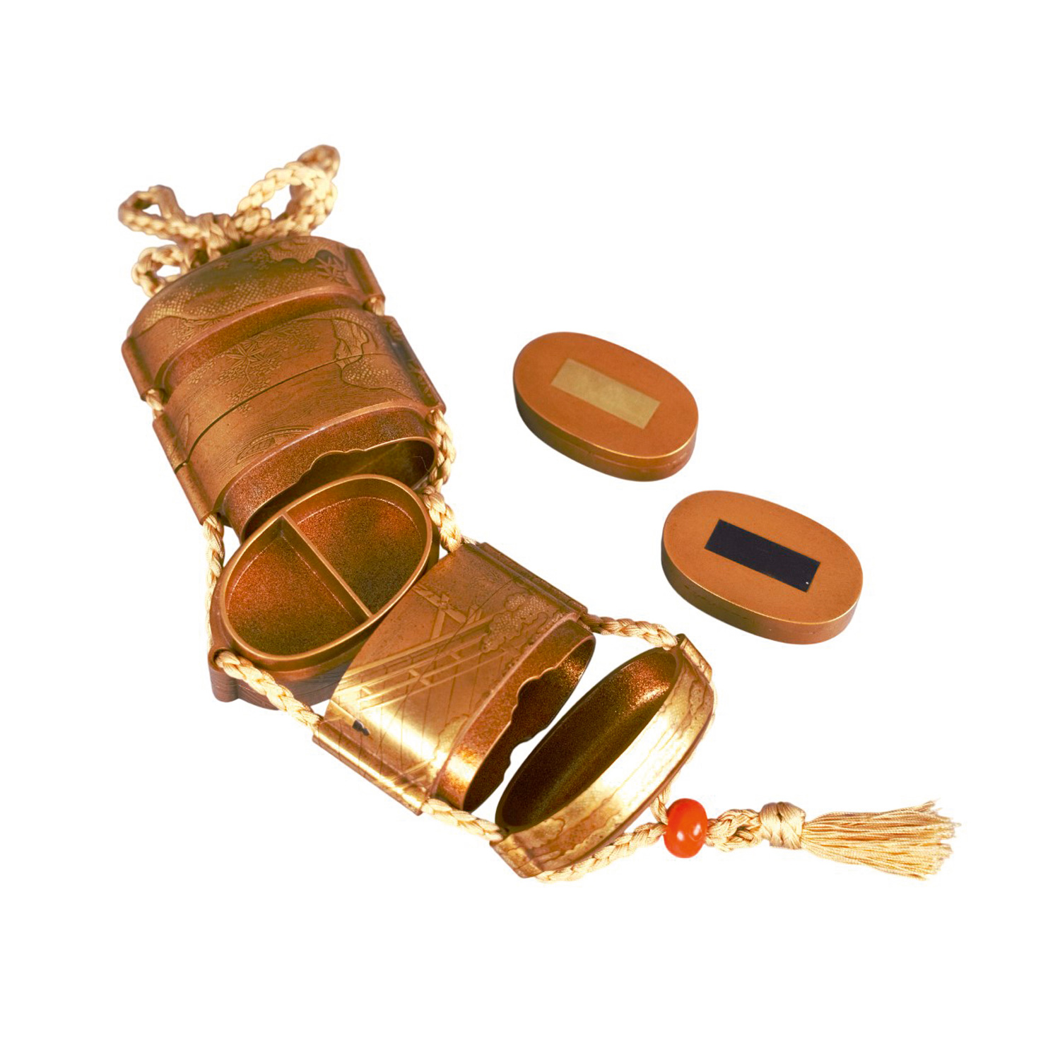 Inrô mit Flussszene. 8-teiliges Aufbewahrungs-Behältnis. Holzgefäß mit Kinji-Goldlackgrund und Hiramakie in Gold und mit Kupfer- und Silberstiftintarsien, darstellend eine Brücke am Fluss mit einem Ruderer. Innen Nashiji-Streulack in Goldbraun. 10 x 5 x 3 cm. Mit beigefarbener Flecht-Kordel sowie einer orangefarbenen Ojime-Schmuckperle. Japan, Meiji-Zeit, 19. Jahrhundert.