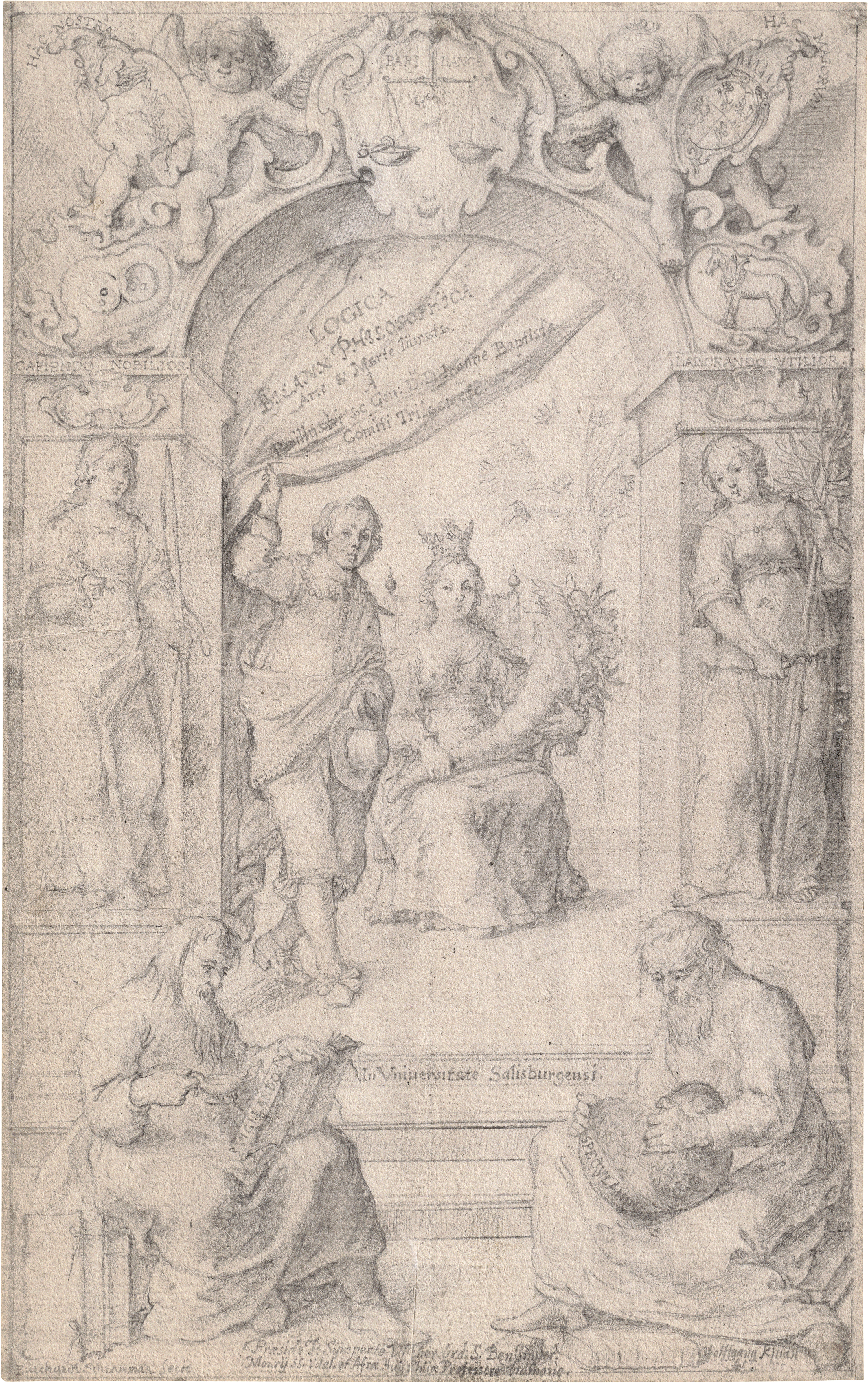 Titelblattentwurf zu Sympert Visscher und Johannes Battista Trilaci "Logica, bilanx philosophica, arte et marte liberata".