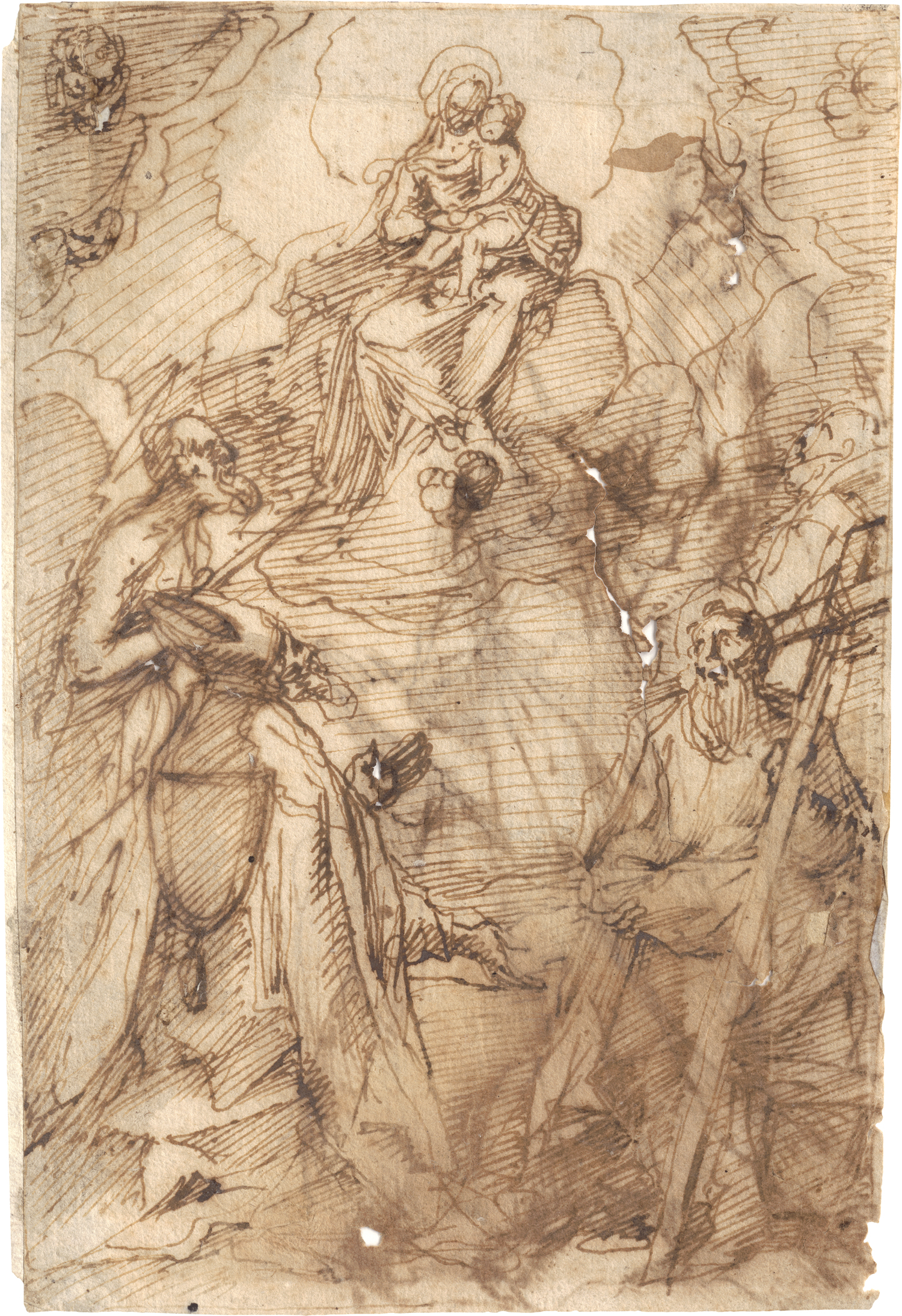 um 1600. Maria mit Kind in den Wolken und Heilige