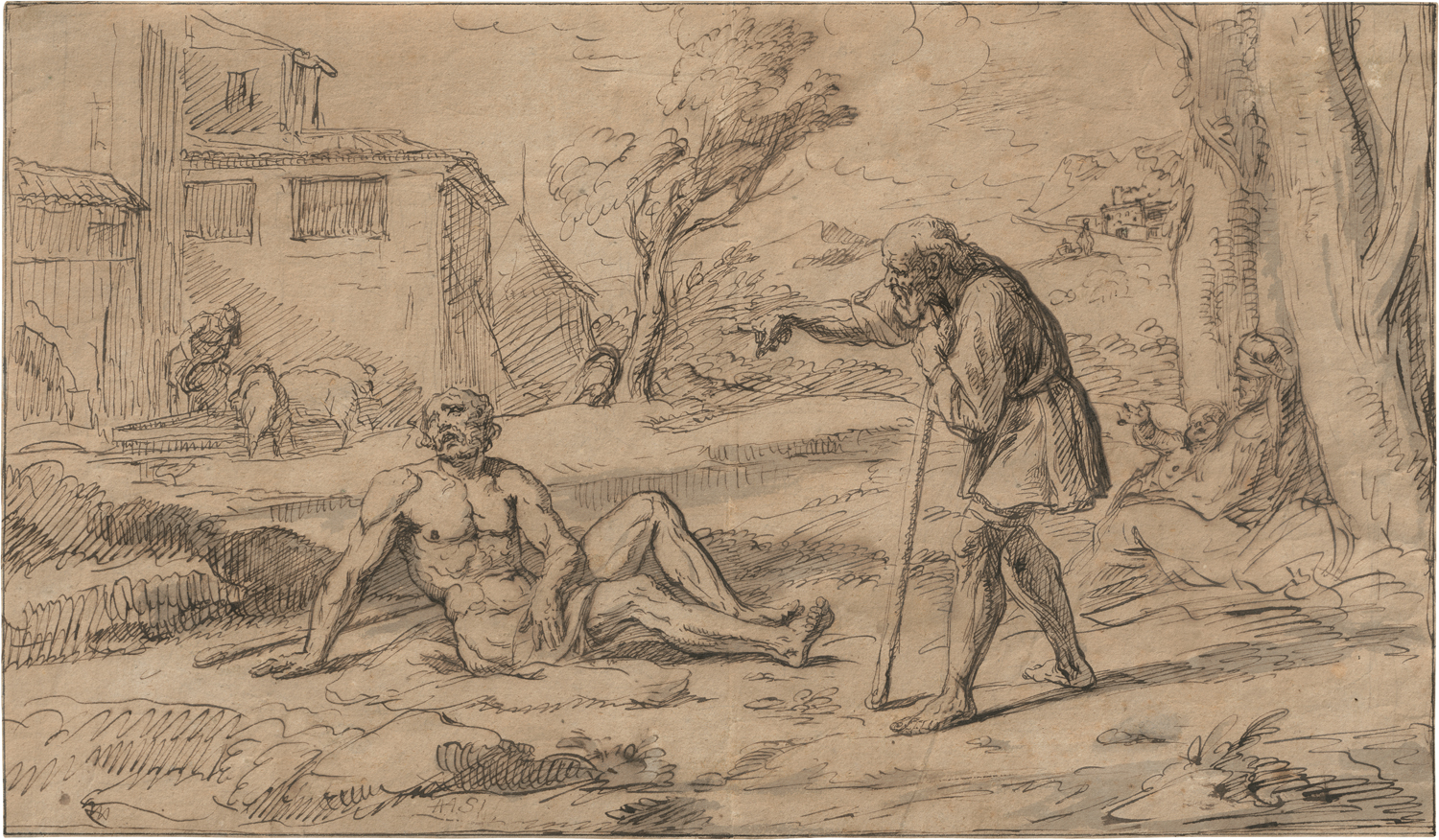 Feder in Braun, partiell grau laviert, auf einem alten Untersatz. 27,3 x 47 cm. Unten bezeichnet "AASI", auf dem Untersatz verso eine alte Zuschreibung an Ventura Salimbeni.