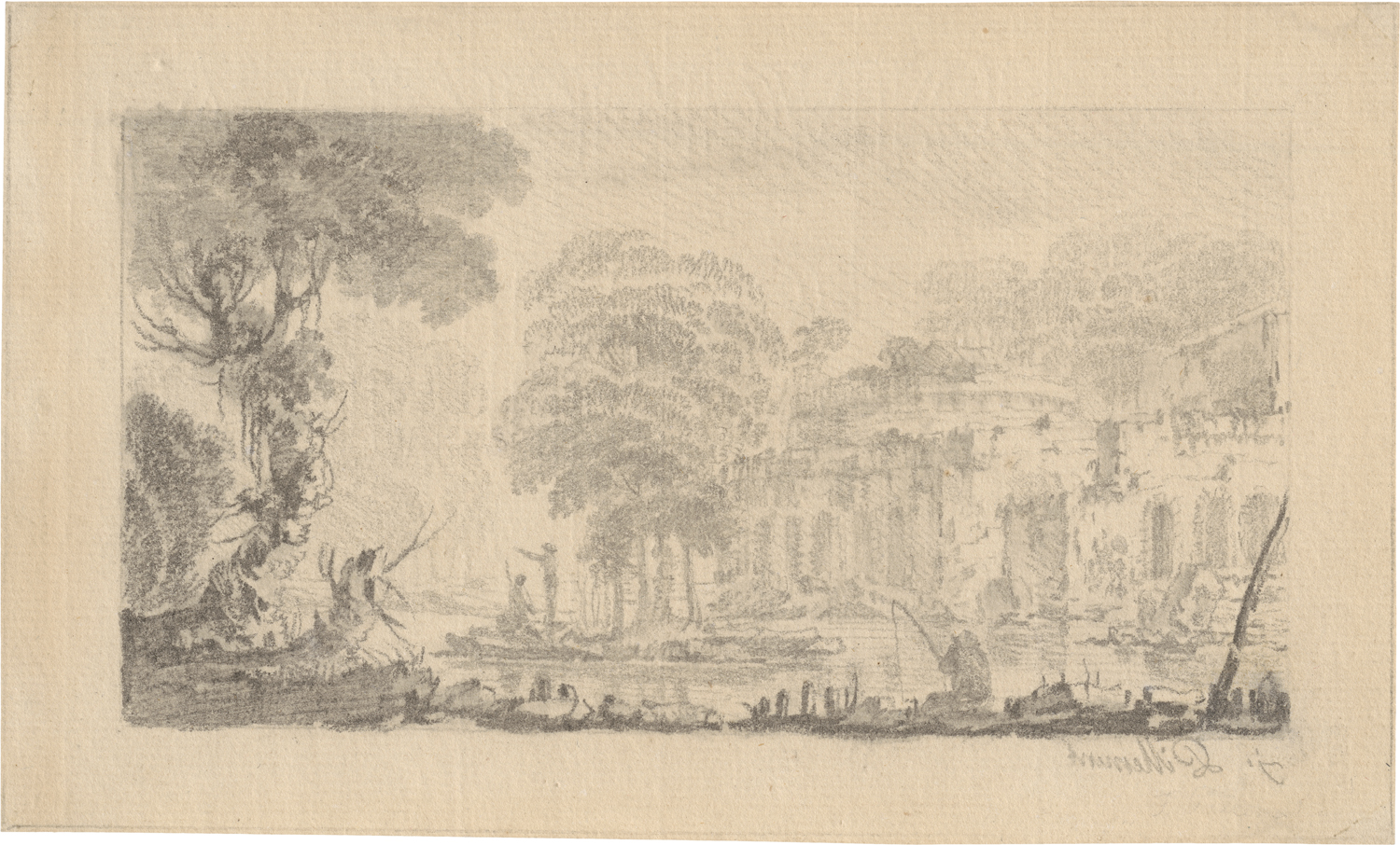 Nach dem verlorenen Deckenfresko Vouets für die Bibliothek im Hotel Séguier in Paris, das durch den Nachstich Michel Dorignys von 1640 größere Bekanntheit erreichte. Beigegeben eine Sebastien Bourdon zugeschriebene Zeichnung "Ruhe auf der Flucht nach Ägypten" sowie von Jean-Baptiste Pillement "Flusslandschaft mit verfallener Palastanlage".