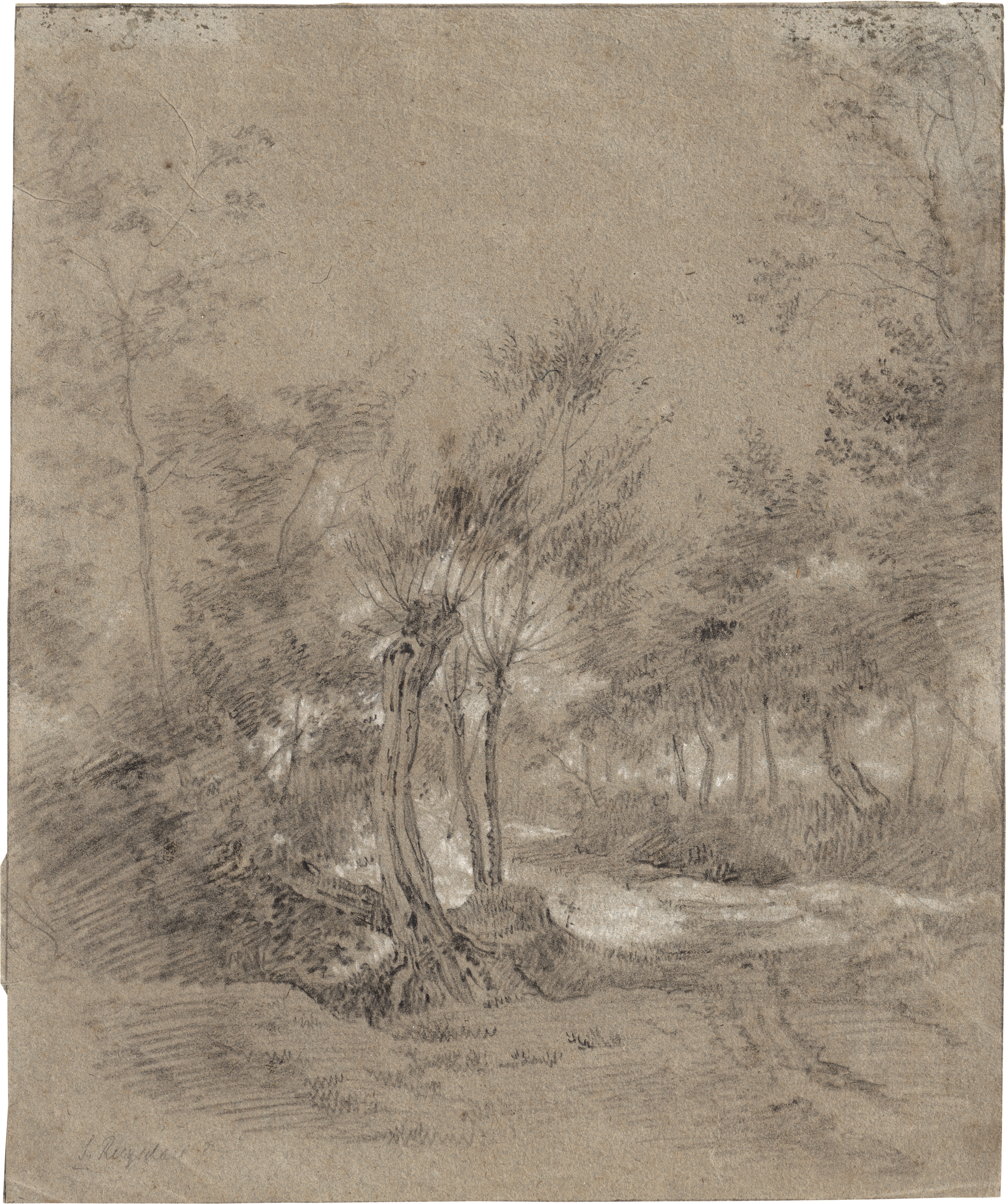 Schwarze Kreide, weiß gehöht, auf grünlichem Papier. 29,1 x 24,1 cm. Unten links mit Bleistift bezeichnet "S. Ruysdael".