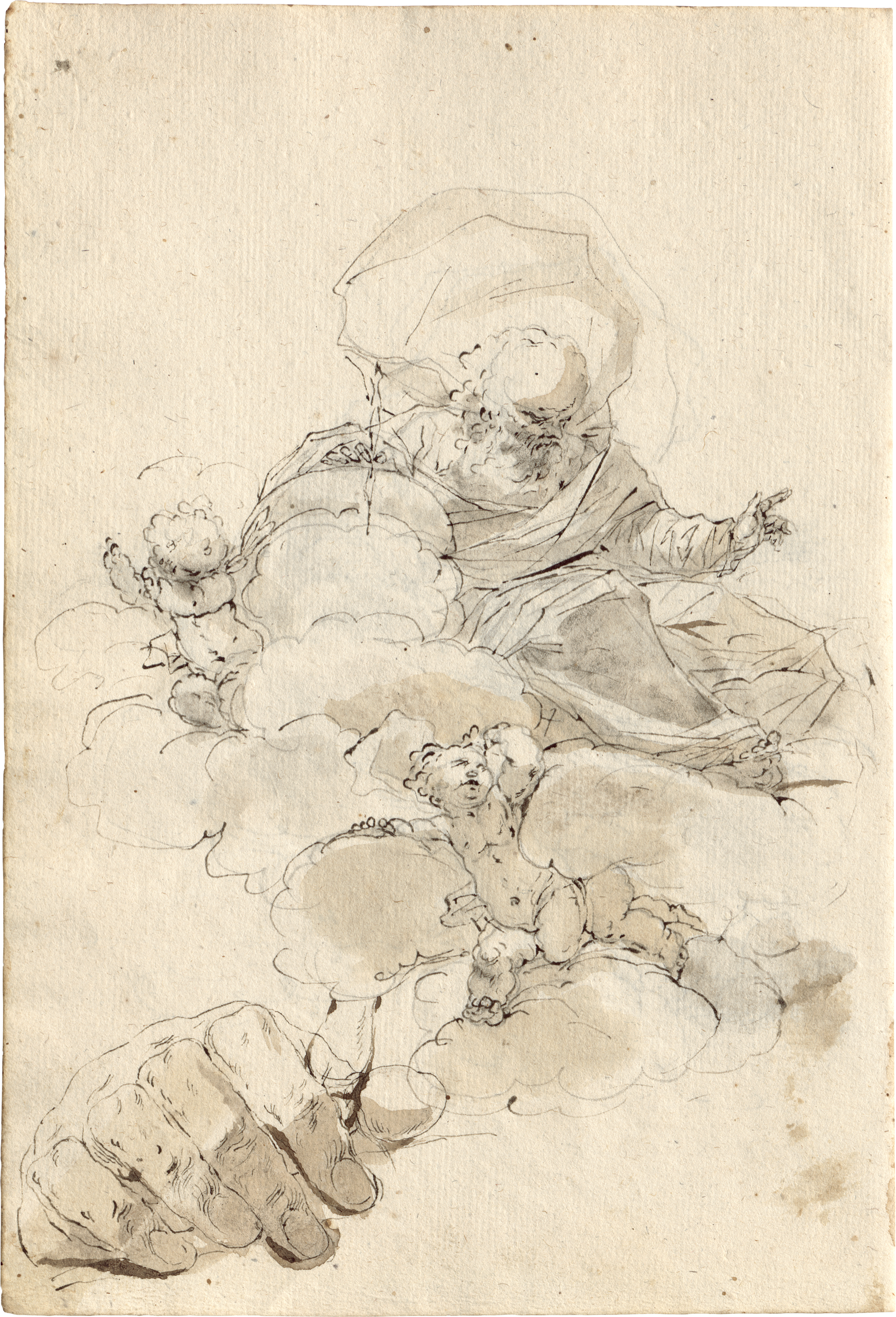 Kompositionsstudien zu biblischen Szenen: Gottvater in den Wolken, Engel, Detailstudien zu Händen und Füßen.