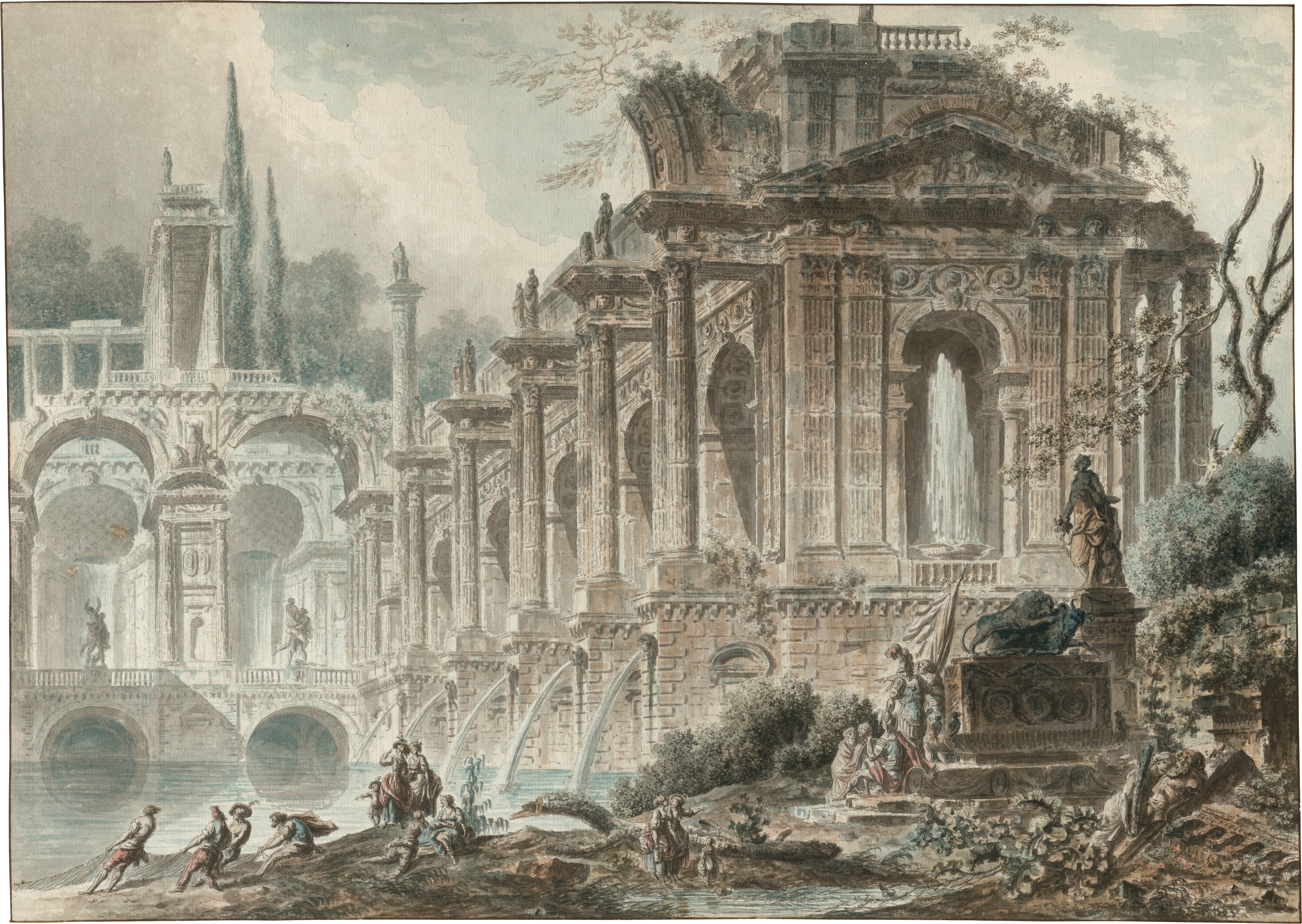 Die beiden vorliegenden, detailliert und souverän ausgeführten Aquarelle bestechen durch ihre raffinierte und aufwendige Bildregie und durch ihre Fülle an reizvollen Einfällen und anekdotischen Details, ein Aspekt, der ebenfalls an Pernets genialen Zeitgenossen Desprez erinnert. Ein stilistisch sehr ähnliches Aquarell von etwa gleich großem Format befindet sich in der Sammlung des Royal Institute of British Architects in London (siehe Piranèse et les Français 1740-1790, Rom 1976, Abb. 130).