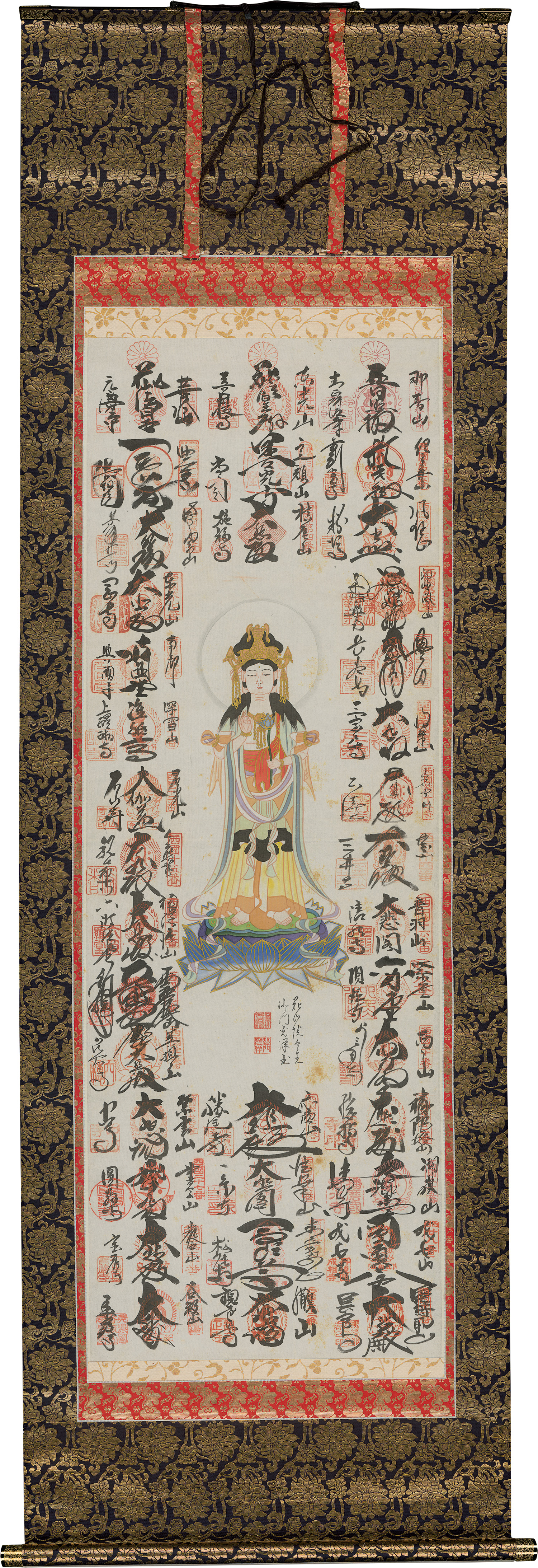 Zentral zeigen die Kakemono-Rollen die Ikonendarstellung der Kannon, der buddhistischen Schutzgottheit, umgeben von kalligraphischen Schriften und wohl roten Tempelsiegeln, die den Stationen des Saigoku-Kannon-Pilgerwegs zugeordnet sein dürften. Dieser zählt mit 33 Tempeln in der Kansai-Region zu den ältesten buddhistischen Pilgerpfaden Japans.