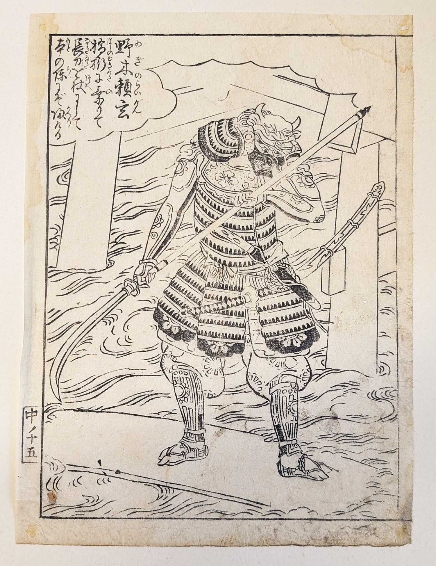 Sukenobu, Nishikawa und Kitao Shigemasa. 32 Holzschnitte mit figürlichen Darstellungen aus einer Heldensaga sowie Szenen des Alltagslebens verschiedener Berufsgruppen. Schwarzdruck auf feinem Japan, überwiegend doppelseitig aus Ehon-Alben stammend. Verschiedene Formate, oft chûban. Je ca. 21,5 x 28,5 cm. Lose Blätter überwiegend auf Trägerkarton montiert. Ende 18. Jahrhundert.