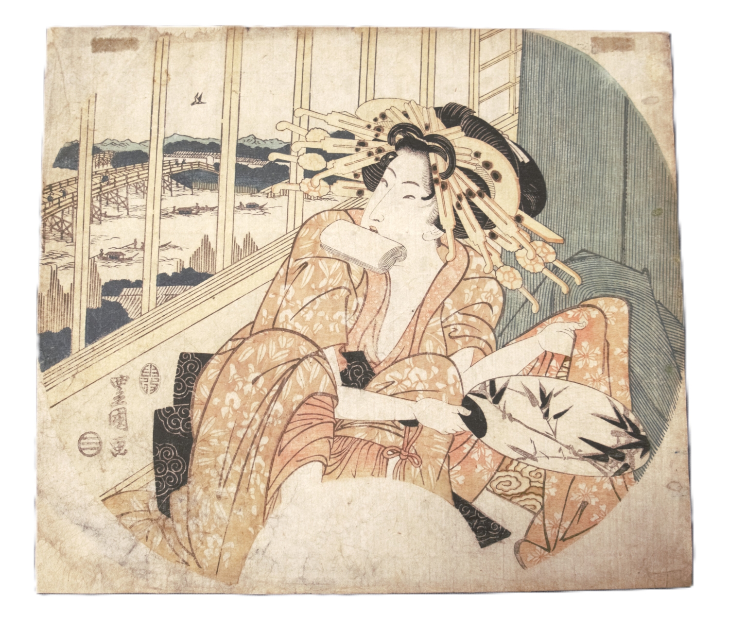 Der Japaner Utagawa Toyokuni (1769-1825) gilt als einer der wichtigsten Holzschnittkünstler des 18. Jahrhunderts und prägte die Utagawa-Schule mit seinem Malstil. – Fragmentarisch erhalten. Hinterlegt, etwas berieben knittrig. Kleine Säurespur durch die Klebestreifen. Stark restauriert, verso mit neuerem Papier fachmännisch verstärkt uns ausgebessert.