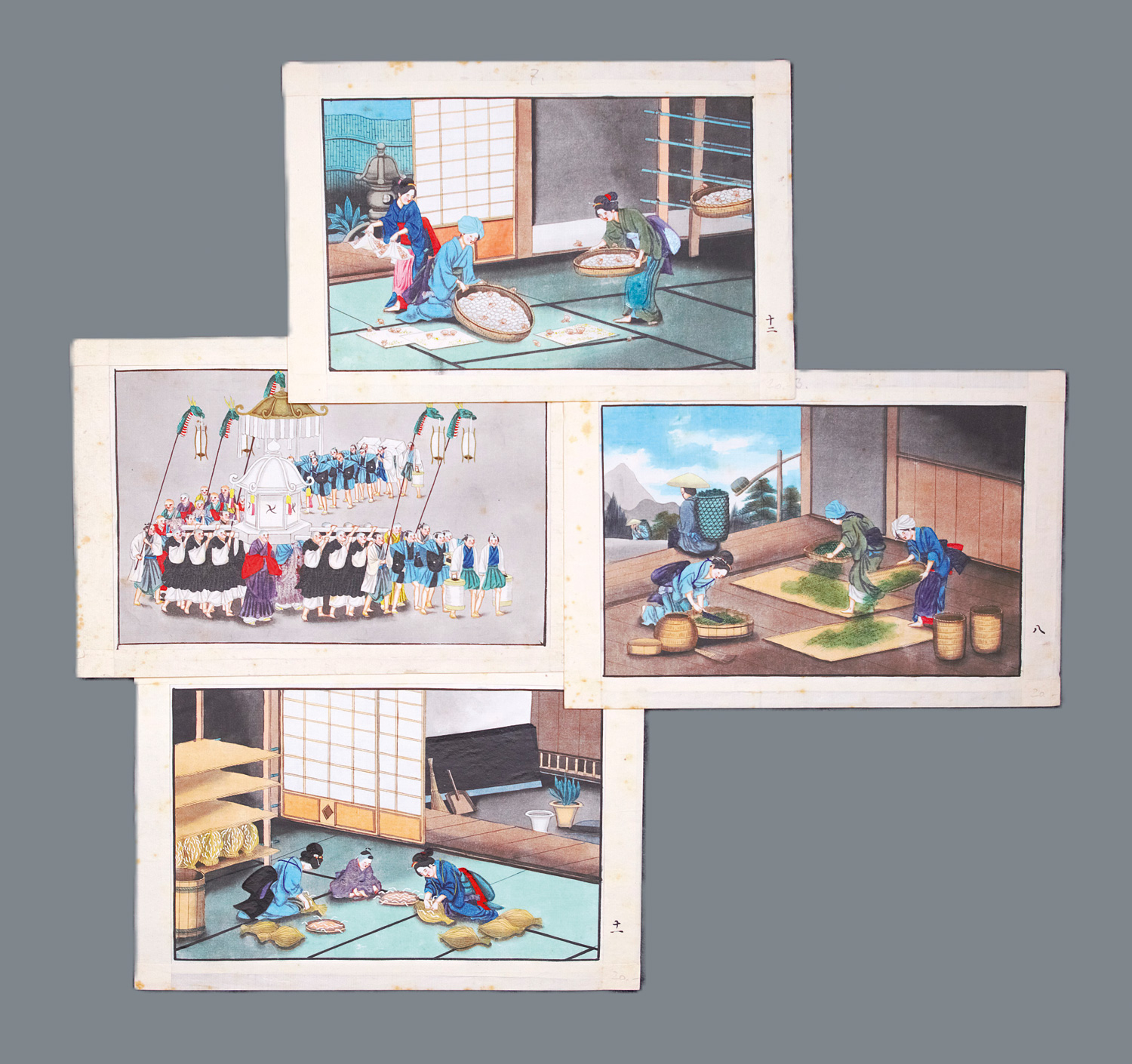 Wohl schon in der Nach-Edo-Zeit, in der Meiji-Epoche entstandene Reflektionen auf das traditionelle japanische Leben vor der Öffnung des Landes. Dargestellt sind Frauen beim Binsenknüpfen, wohl beim Sammeln der Seidenraupen, beim Reissieben und Kämmen etc. Das letzte Bild zeigt die Darstellung einer religiösen Zeremonie. – Geringe Gebrauchsspuren, in den Darstellungen meist sehr sauber und frisch.