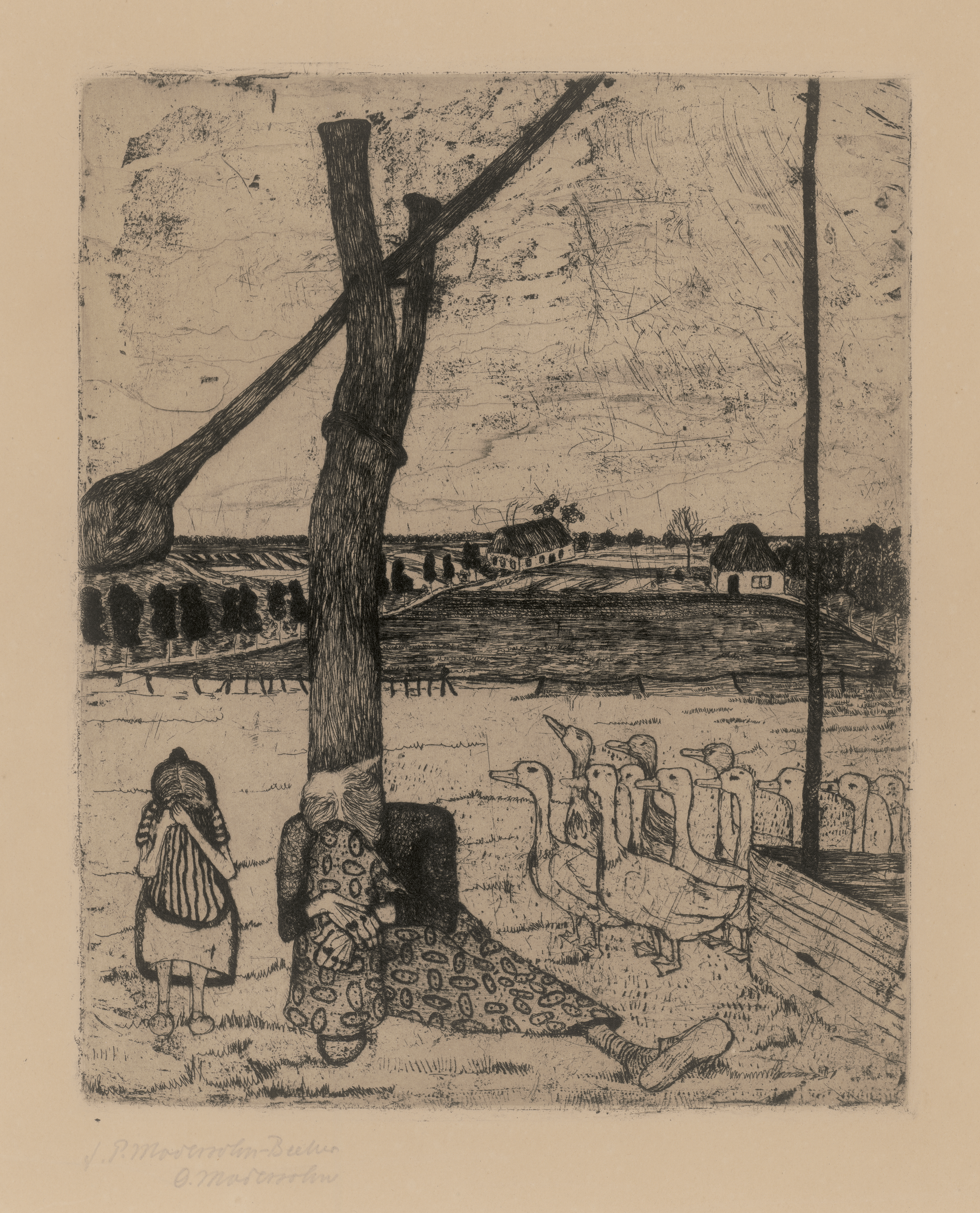 Lediglich 13 Radierungen schuf Paula Modersohn-Becker in den wenigen Jahren als Künstlerin; sie alle entstanden wohl 1899. Der vorliegende postume Abzug wurde von der Worpsweder Künstlerpresse zwischen Mai 1921 und Oktober 1923 im Auftrag von Otto Modersohn gedruckt. Zuweilen trägt die atmosphärische Darstellung auch den Untertitel "Das Märchen von der verlorenen Gans", der die vorwurfsvolle Haltung der Gänseschar und das Weinen der Magd und des kleinen Mädchens erklärt. Ausgezeichneter Druck mit durchgehendem, zartem Aquatintaton und breitem Rand.
