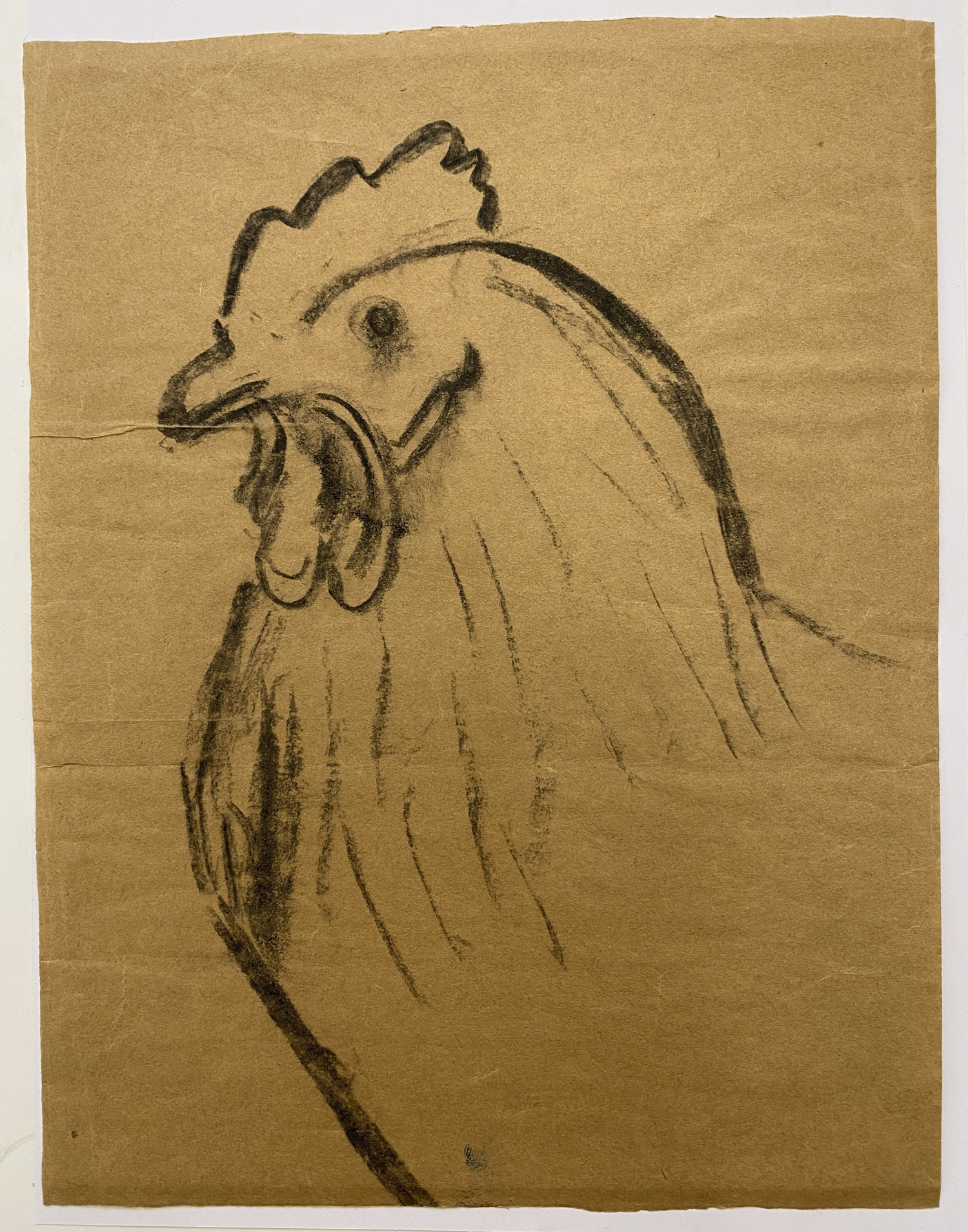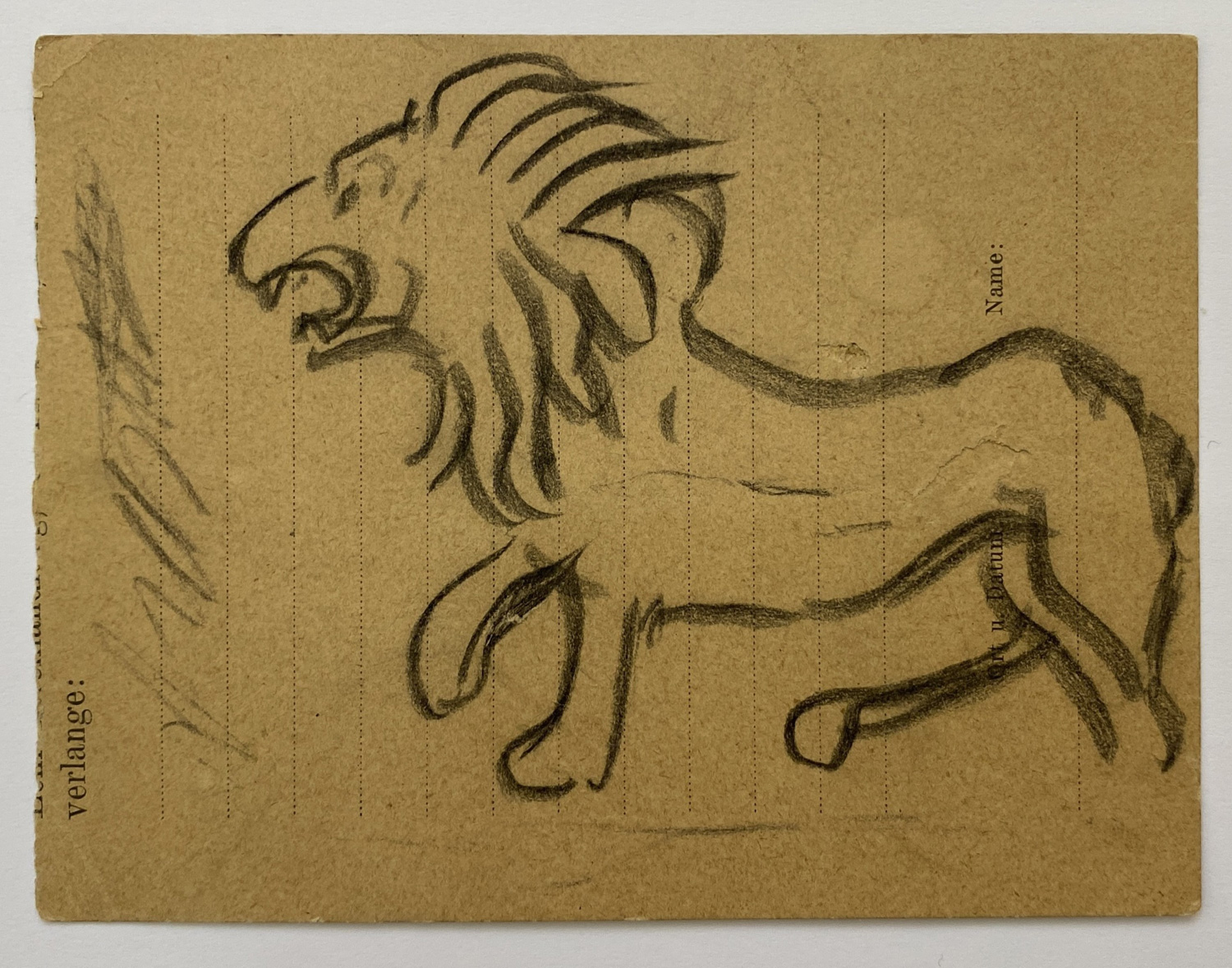 Archetypische Figuren, zeitlose und universelle Motive zeichnet Rohlfs für die fünf Kinder seines Mäzens. Auf Einladung seines Förderers Karl Ernst Osthaus lebte und arbeitete der Künstler seit 1901 in Hagen, wo er, befreit von wirtschaftlicher Not, Atelierräume im neu gegründeten Hagener Museum bezog und eine Malschule des Folkwang-Museums leitete. Fortan gehörte er fast zur Familie Osthaus; besonders zu den Kindern Eberhard, Waldemar, Manfred, Helga und Immogen hatte er ein inniges, liebevolles Verhältnis und fertigte für sie zur Freude und Unterhaltung spontan kleine Bilder an. Auf vorgefundenen unterschiedlichen Papieren, teils auf Resten, Briefumschlägen oder Werbezetteln zeichnet Rohlfs einfache, kindliche Motive: ein reitender König, Offizier und Bettler, zwei Hähne, Löwe und Krokodil, festgehalten mit kräftigen, breiten Konturen und klaren, vereinfachten Formen.