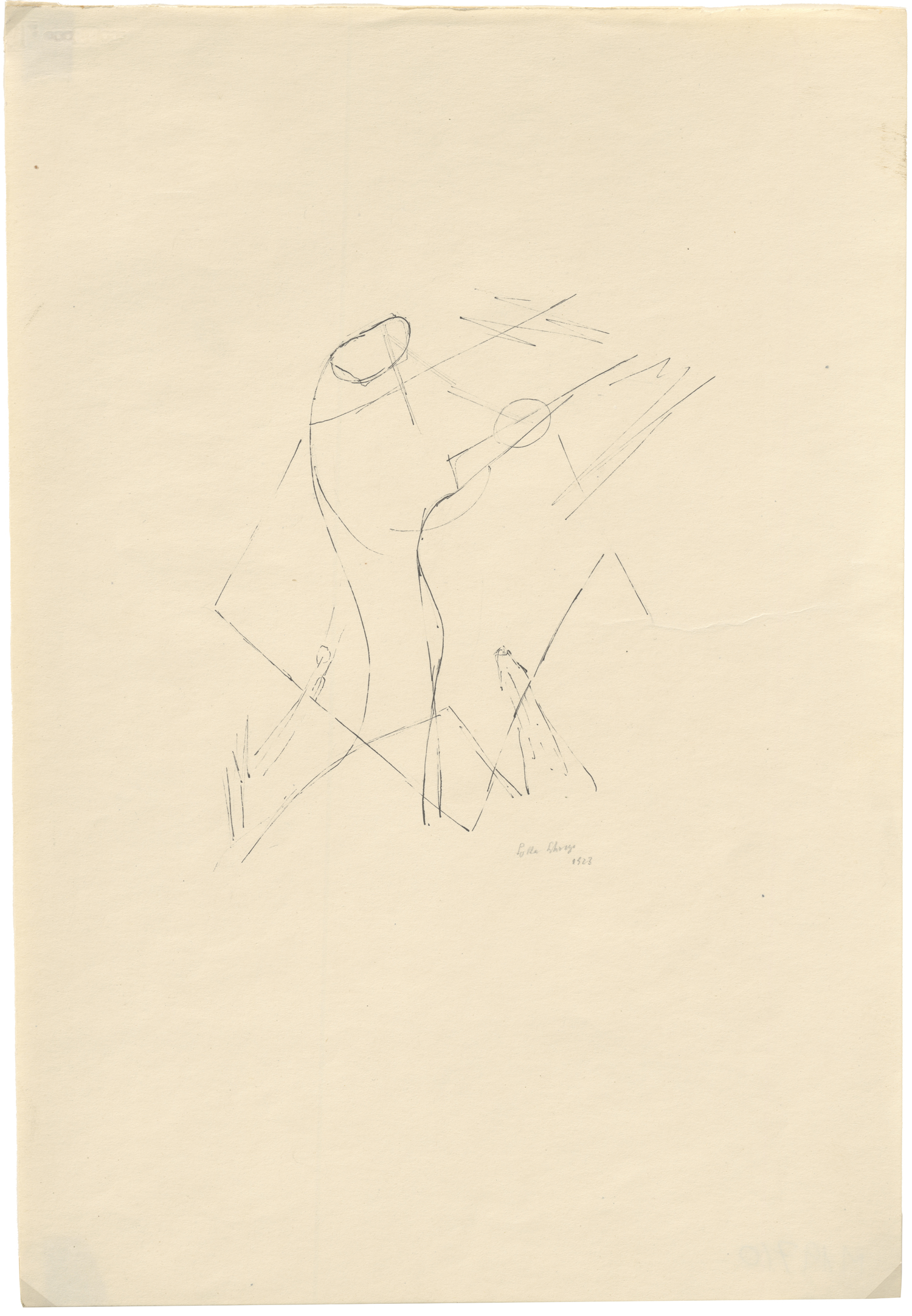 Nach seiner juristischen Promotion in Leipzig arbeitete Lothar Schreyer als Dramaturg am Deutschen Schauspielhaus Hamburg, seit 1919 leitete er zunächst die Kampfbühne in Hamburg, später war er an der Sturm-Bühne in Berlin tätig. Walter Gropius holte Schreyer 1921 für die Bühnenwerkstatt und die Maskenspiele ans Bauhaus. Bis 1926 arbeitete Schreyer an Herwarth Waldens Zeitschrift Der Sturm als Redakteur und Schriftleiter; zu dieser Zeit entstand die vorliegende dynamische, kristalline Federzeichnung. Beigegeben: Eine Farbstiftzeichnung auf Transparentpapier, möglicherweise von Lothar Schreyer.