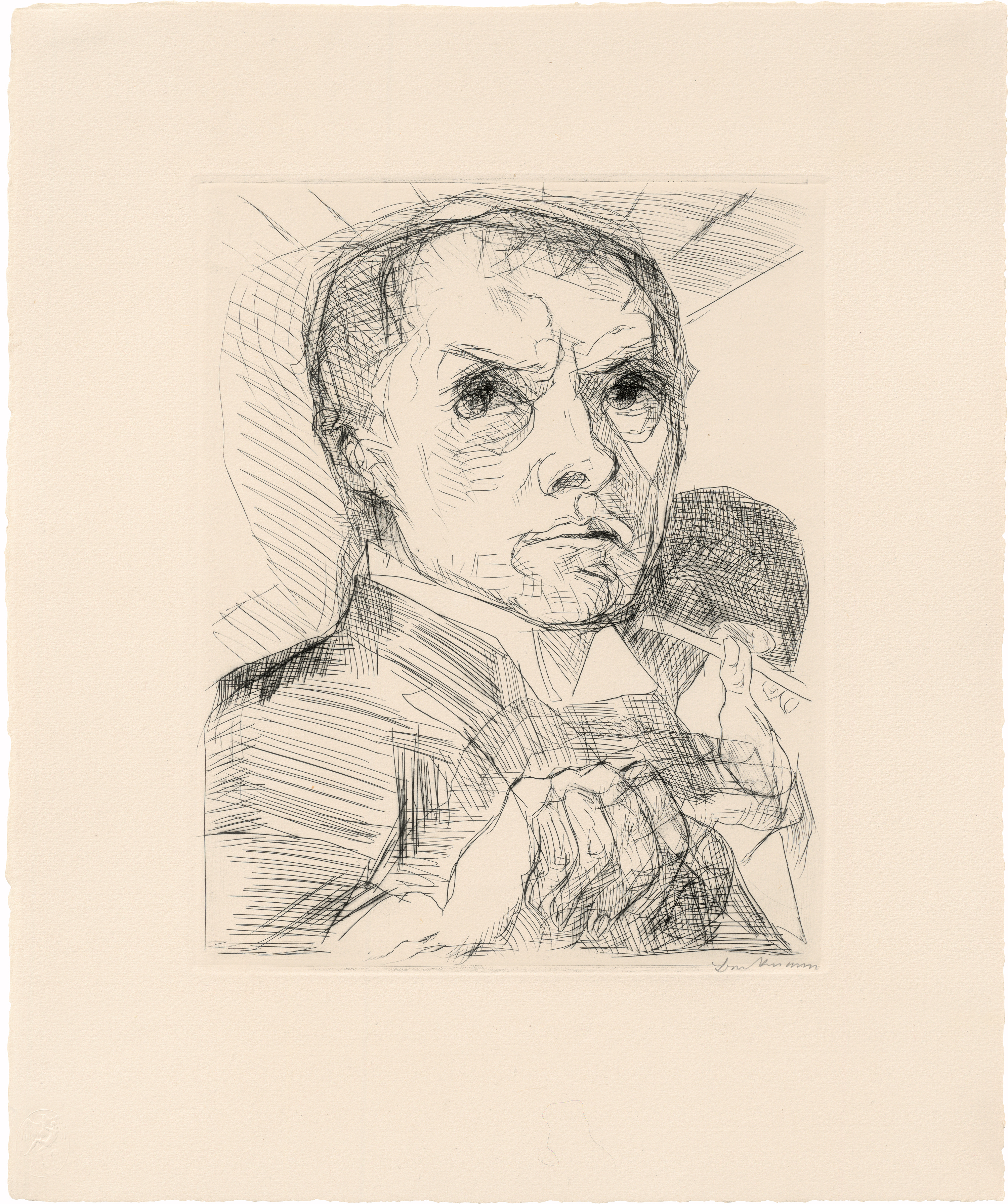 Blatt 19 der Folge "Gesichter", erschienen im Verlag der Marées-Gesellschaft, R. Piper & Co., München 1919, in einer Gesamtauflage von 100 Exemplaren mit dem Trockenstempel in der linken unteren Ecke. Neben 60 Exemplaren auf Bütten wurden zunächst 40 Drucke von der noch unverstählten Platte für die Luxusausgabe der Mappe auf Japan abgezogen. Der Prospekt der Marées-Drucke, der das Erscheinen ankündigte, warb mit dem "Selbstbildnis mit Griffel", verkleinert abgebildet. Anfangs plante Beckmann die Veröffentlichung zwei getrennter Portfolios: eines ausschließlich mit Kriegsbildern und das andere mit Eindrücken des Großstadtlebens, das Beckmann "Welttheater" nennen wollte. Durch Julius Meier-Graefes Anregung erschienen die Arbeiten dann aber zusammengefasst in einer Mappe unter dem Titel "Gesichter". Die 19 Blätter der Folge bilden keine narrative Sequenz, sondern Momentaufnahmen des Lebens. Beckmanns eigenes Gesicht erscheint darin leitmotivisch in mehreren Portraits, eines zu Beginn, mit dem er in den Zyklus einführt, und das hier vorliegende als Schlussbild; "geläutert geht er aus diesen Szenen hervor, erstarkt und in höchster Spannung wachsam. Er ist nicht mehr der abweisende Beckmann in gedrückter Haltung des ersten Selbstbildnisses: der Zyklus ist geschlossen, ein neuer Anfang ist offen" (B. Haldner, in: Gesichter von Tag und Traum: aus dem graphischen Werk von Max Beckmann, Ausst.-Kat. ETH Zürich 1984, S. 40). Max Beckmann zeichnete, malte, radierte und lithographierte so zahlreiche Selbstportraits wie kaum ein anderer Künstler der Moderne. Das "Selbstbildnis mit Griffel" ist ein herausragendes Beispiel für seine künstlerische Selbstbefragung, für die energische Auseinandersetzung mit dem eigenen Angesicht, seine Suche nach dem "wahren" Selbst hinter der äußeren Erscheinung, und zugleich zeigt es den Künstler im Zusammenhang der "Gesichter" hellsichtig gegenüber den alptraumhaften Verwerfungen des Ersten Weltkrieges. Druck des endgültigen Zustandes von der verstählten Platte, in einem prachtvollen, klaren Abzug mit dem vollen Rand.