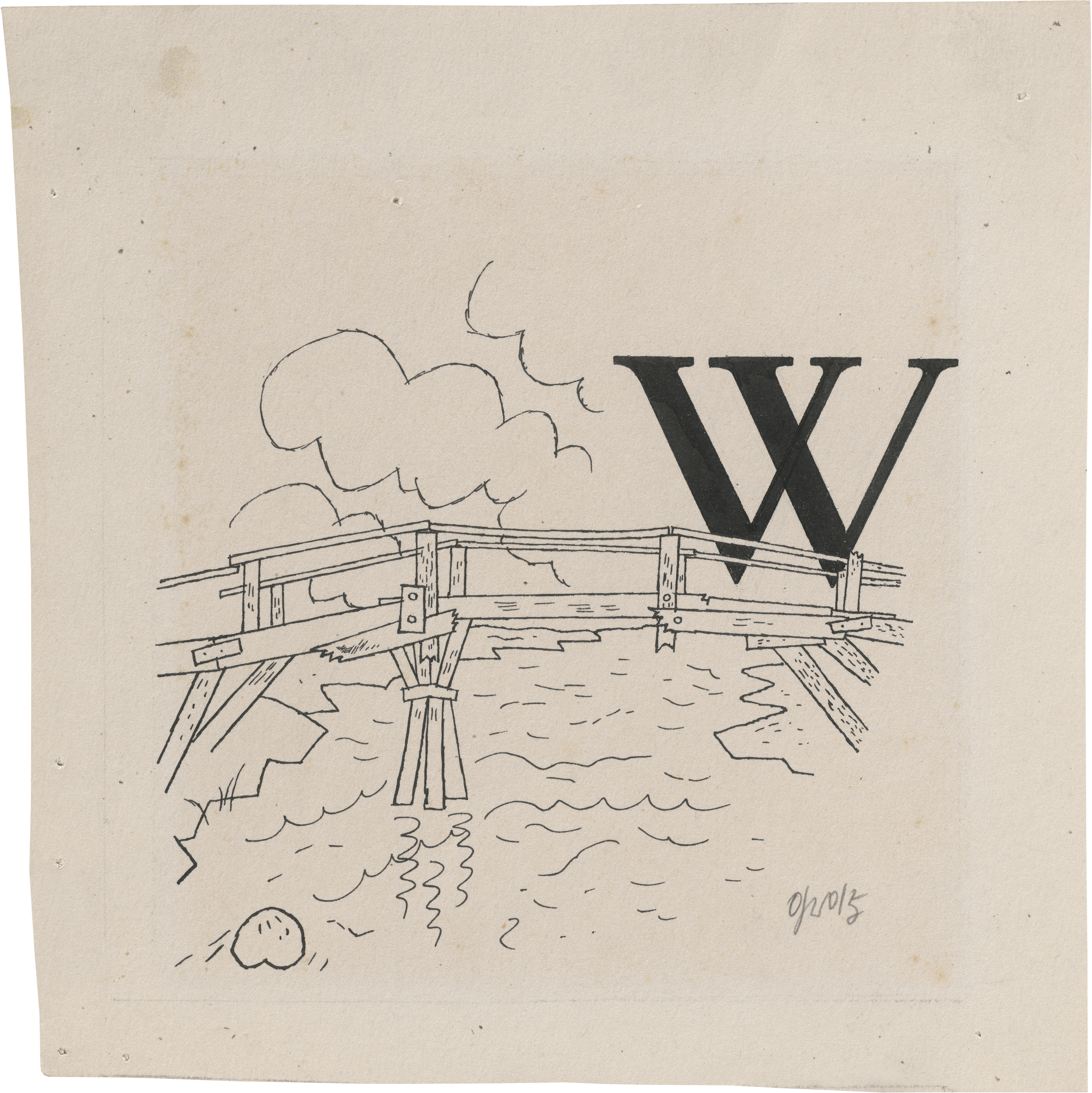 Grosz' Entwurf zur Initiale "W", verdeutlicht durch das Wasser eines Flusses, der unter einer baufälligen Holzbrücke hindurchfließt, entstand für die deutsche Ausgabe von Alphonse Daudets "Die Abenteuer des Herrn Tartarin aus Tarascon", die 1921 im Erich Reiss Verlag erschien (vgl. Dückers BA I). Hierzu lieferte Grosz zahlreiche Vollbilder, Vignetten und Initialen wie die vorliegende zum Buchstaben "W". Dieser stand am Anfang des sechsten Kapitels, S. 32, "Die beiden Tartarins", das mit dem Satz "Wie, zum Teufel, war es nur möglich, dass bei dieser Sucht nach Abenteuern ..." beginnt. Die Zeichnung wurde unverändert abgedruckt. Das Original ist zudem signiert. Mit einer schriftlichen Bestätigung von Ralph Jentsch, Berlin, vom 14.10.2025. Die Arbeit wird in das in Vorbereitung befindliche Werkverzeichnis der Arbeiten auf Papier aufgenommen.