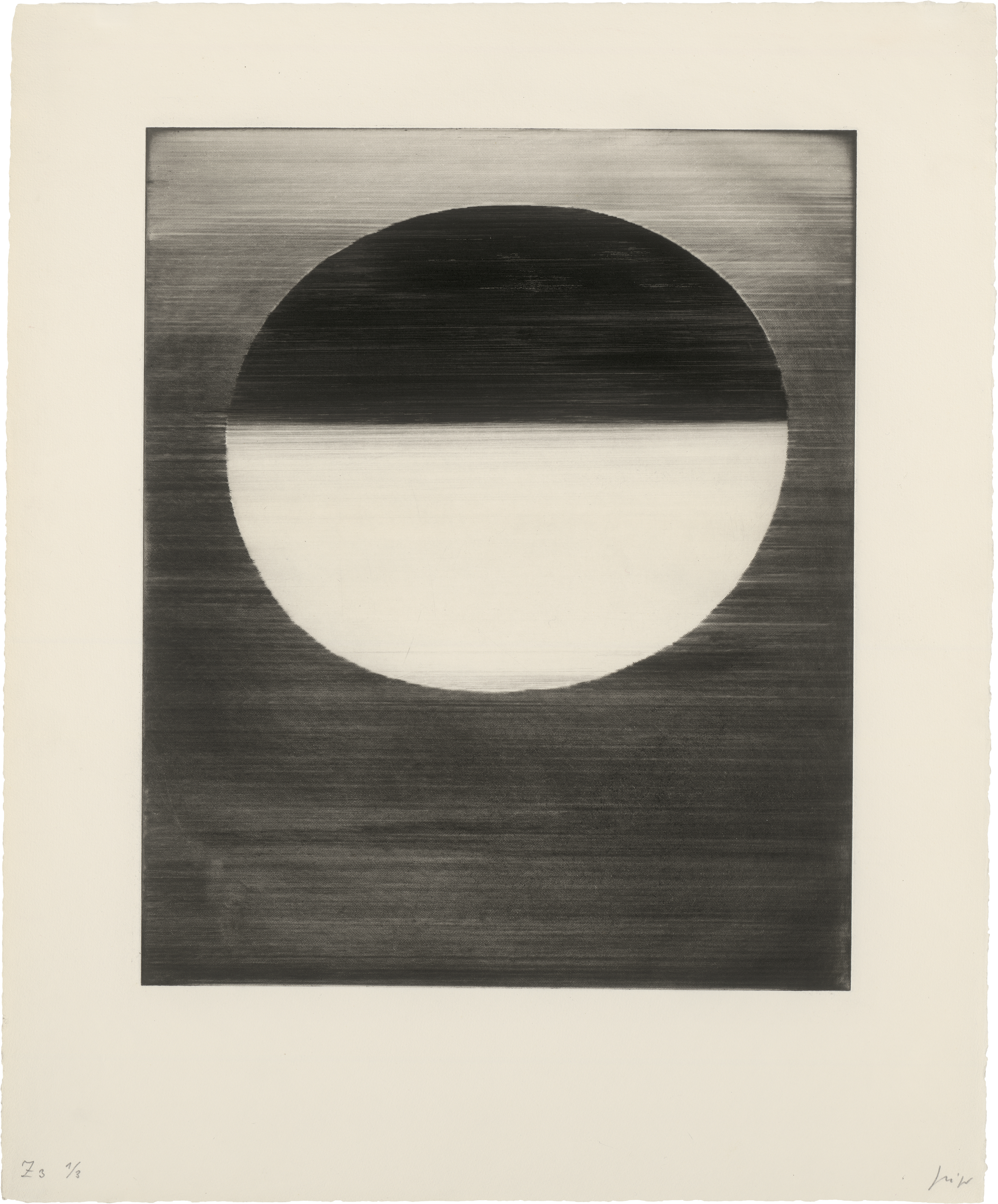 Folge von vier Kaltnadelarbeiten, alles Exemplare außerhalb des in einer Auflage von 22 numerierten, signierten Exemplaren erschienenen Mappenwerks "Rupprecht Geiger - Vier Radierungen". "In den 60er Jahren tritt die Form und ihre kompositionelle Verknüpfung zunehmend hinter der Dominanz der Farbe zurück. (...) Die Radierungen, denen Geiger mit Roulette und Lineal die differenziertesten Grauschattierungen abgewinnt, erlauben die Konzentration auf ein wesentliches, durch den Lichtcharakter bedingtes Farbmoment: Die Hell-Dunkel Wirkung." (Heinz Schütz, aus dem Text zur Mappe). Sämtlich prachtvolle, nuancenreiche Drucke mit dem vollen Rand. Sehr selten.