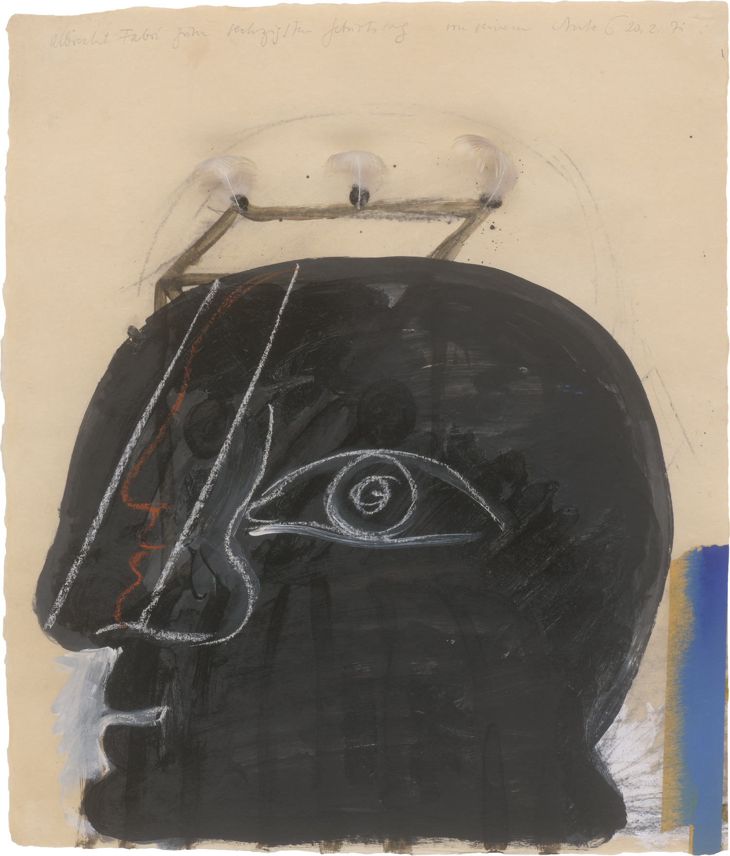 In unendlichen Variationen begegnen uns wuchtige Profilköpfe in Antes' Werk. Sein profundes ethnographisches Wissen - er sammelt unter anderem Kachina-Figuren der Hopi, Federschmuck und Hilfsgeister der Ewe und Dangwe aus Ghana - spiegelt sich immer wieder auch in der Verwendung collagierter Federn, die auch den vorliegenden tiefschwarzen Kopf um geistige Dimensionen bereichern. Mit Widmung des Künstlers an den Kölner Schriftsteller Albrecht Fabri.