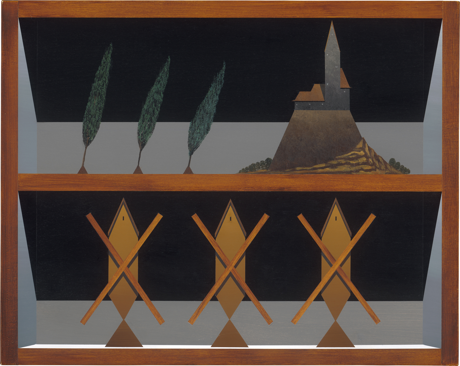 Menschenleer, in surrealer, mystisch wirkender Düsternis zeigt sich die präzise gearbeitete, minimalistische Komposition. Horizontal teilt Schade das Bild in zwei Ebenen, jede wie ein Regalfach kirschholzfarben umrahmt und von schachtelartiger Räumlichkeit, die das Kulissenhafte, Künstliche der Komposition unterstreicht. Das Element der Windmühle, das seit zehn Jahren immer wieder in seinen Gemälden auftaucht, findet sich in dreifacher Reihung als geometrische Form auch hier, und steht wie auch die Motive der stilisierten Bäume und der Burg, für eine zeitlose Allgemeingültigkeit der Bildsprache. "Die Malerei ist sowohl eine geistige als auch eine handwerkliche Tätigkeit. (...) Ähnlich wie ein Modellbauer, der im Keller oder auf dem Dachboden vor seiner Platte sitzt, kreiere ich eine eigene Welt. (...) Es ist bei meiner Malerei auch ganz wichtig, zu betonen, dass es sich um ein zweites Universum, also um eine Parallelwelt, handelt. Meine Welt funktioniert nach ihren eigenen Regeln, bedient sich aber in ihrer Gegenständlichkeit aus unserer Welt." (Titus Schade im Interview mit Kevin Hanschke, collectorsagenda.com, Zugriff 23.09.2025). Nach seinem Studium an der Hochschule für Grafik und Buchkunst Leipzig war Schade Meisterschüler bei Neo Rauch, er arbeitet heute in seinem Atelier auf dem Leipziger Spinnereigelände.