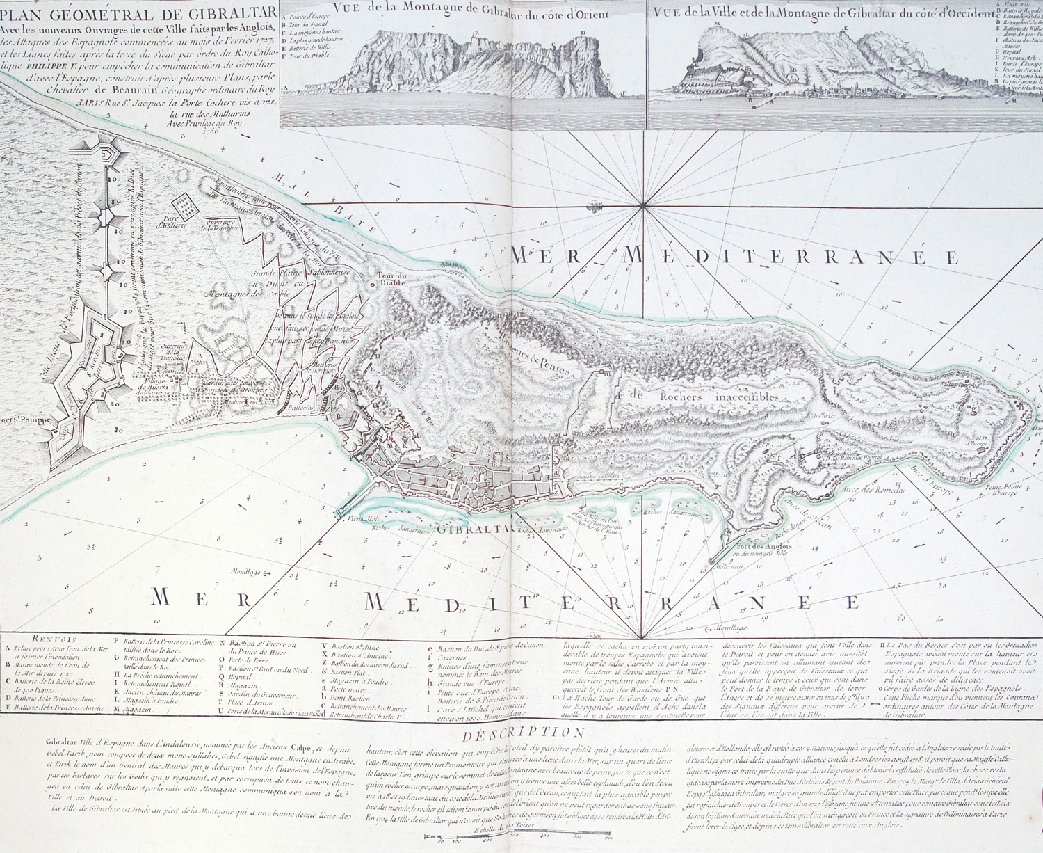 Beaurain, Jean de. Plan géométral de Gibraltar. Avec les nouveaux Ouvrages de cette Ville faits par les Anglois. Grenzkolorierte Kupferstichkarte. 44 x 55,5 cm (Plattenrand) bzw. 55,5 x 78 cm (Blatt). Paris 1756.