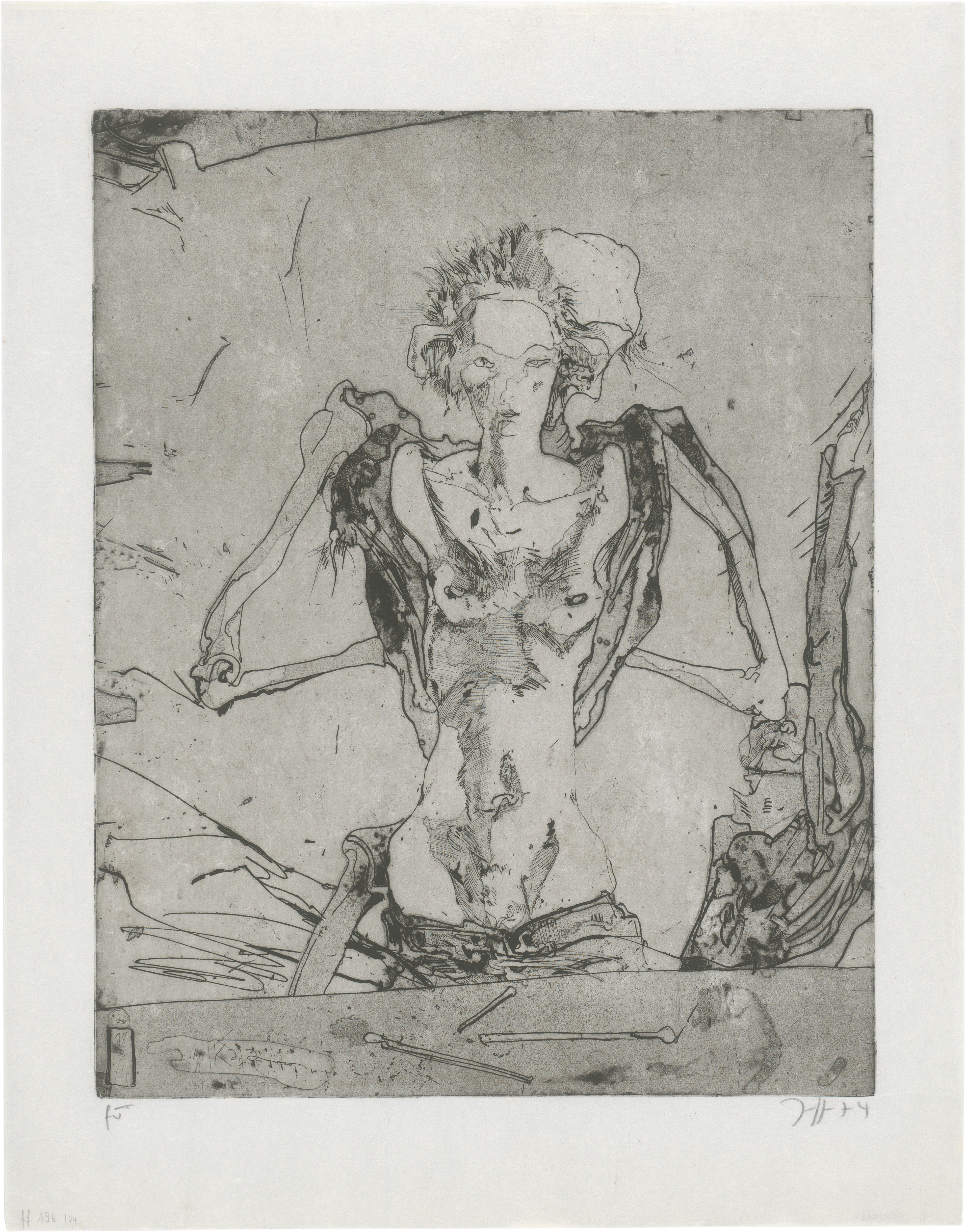 Aus der 11 Radierungen umfassenden Folge "Totentanz", gedruckt bei Volker Sammet, Stuttgart, erschienen in einer Gesamtauflage von 52 Exemplaren. Prachtvoller Druck mit Rand.