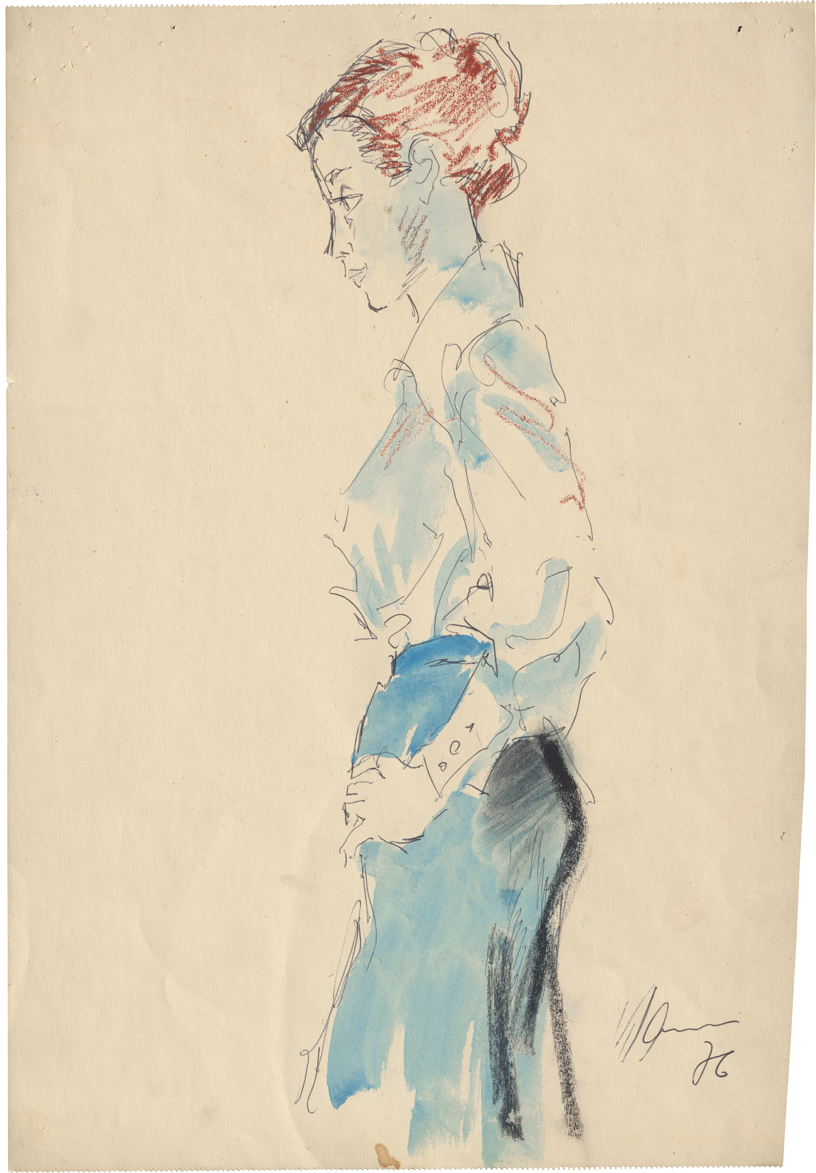 Aquarell, Kohle, farbige Kreiden und Kugelschreiber in Schwarz auf Skizzenblockpapier. 1976.